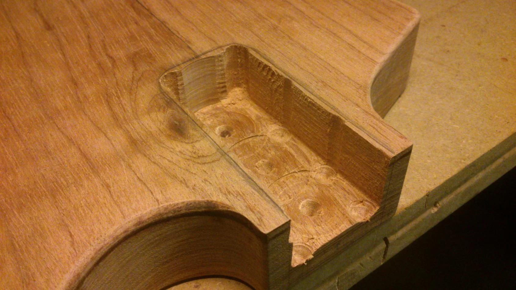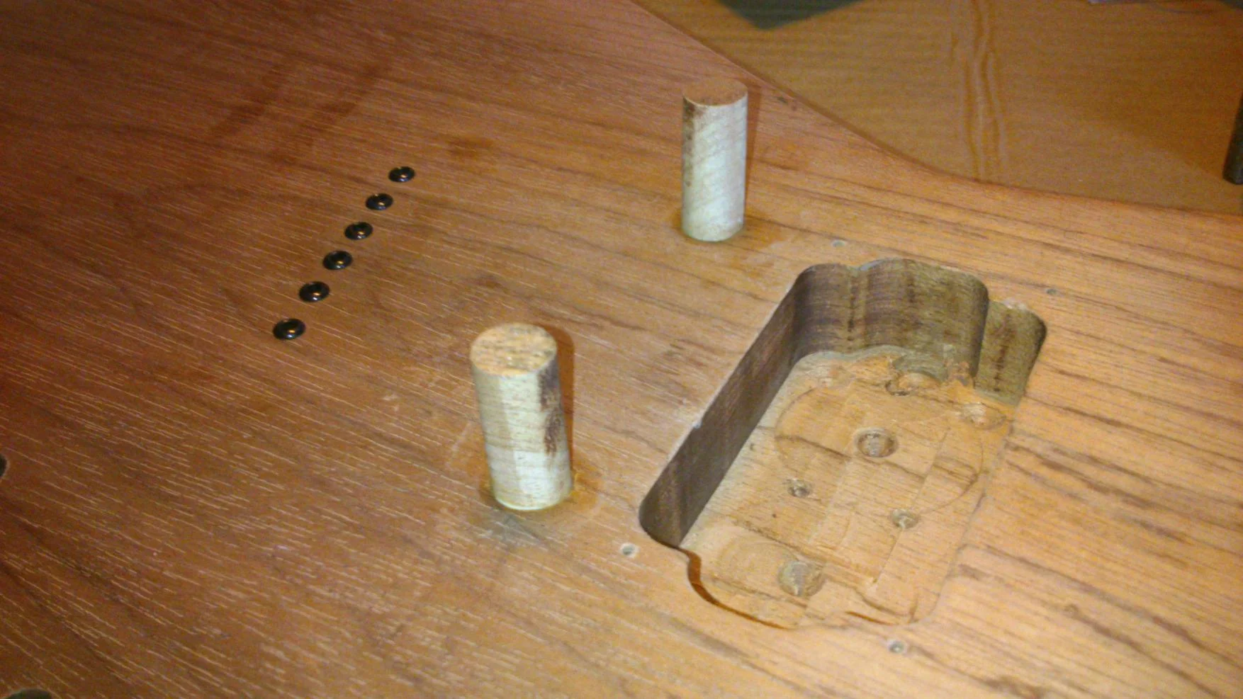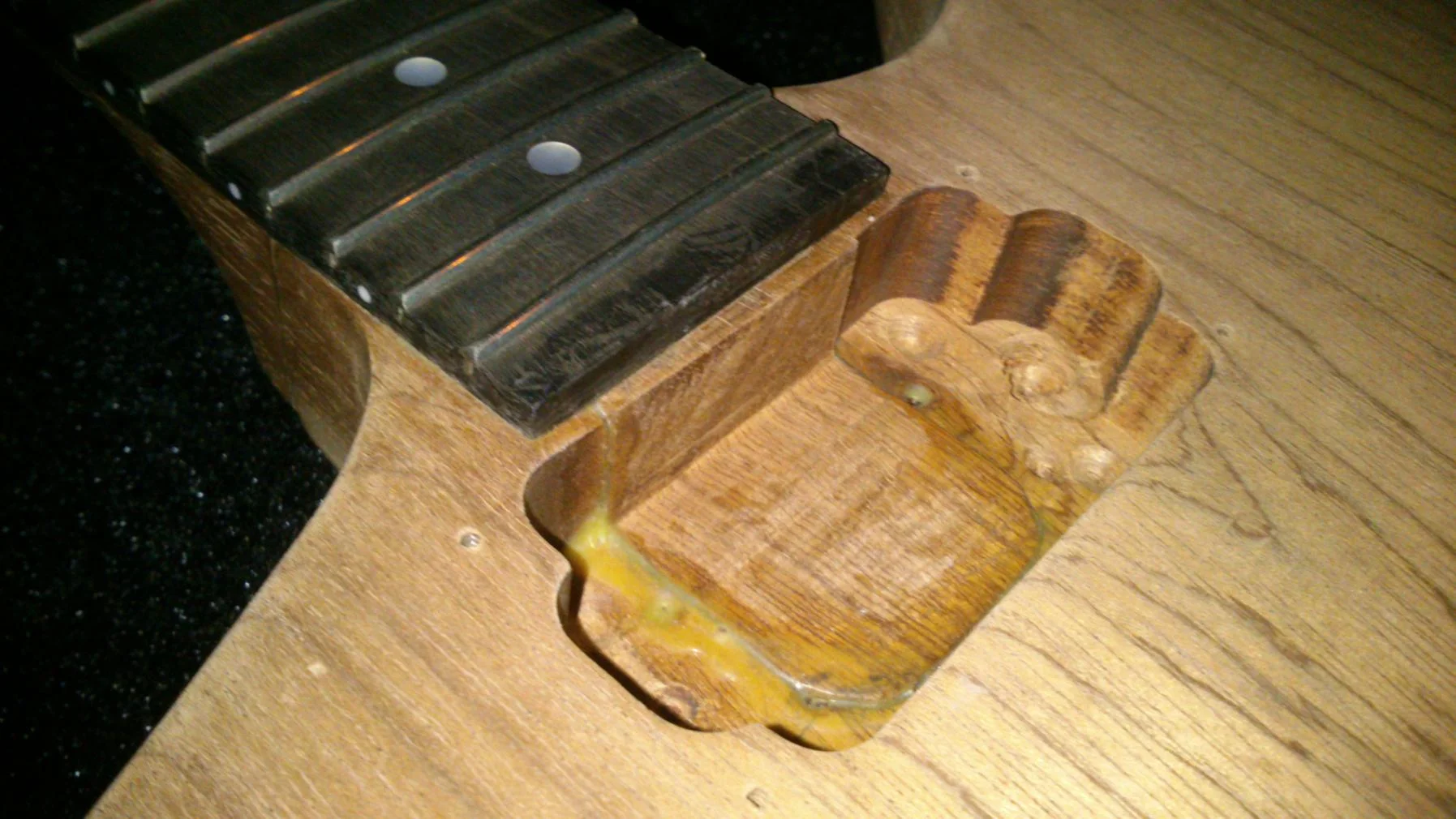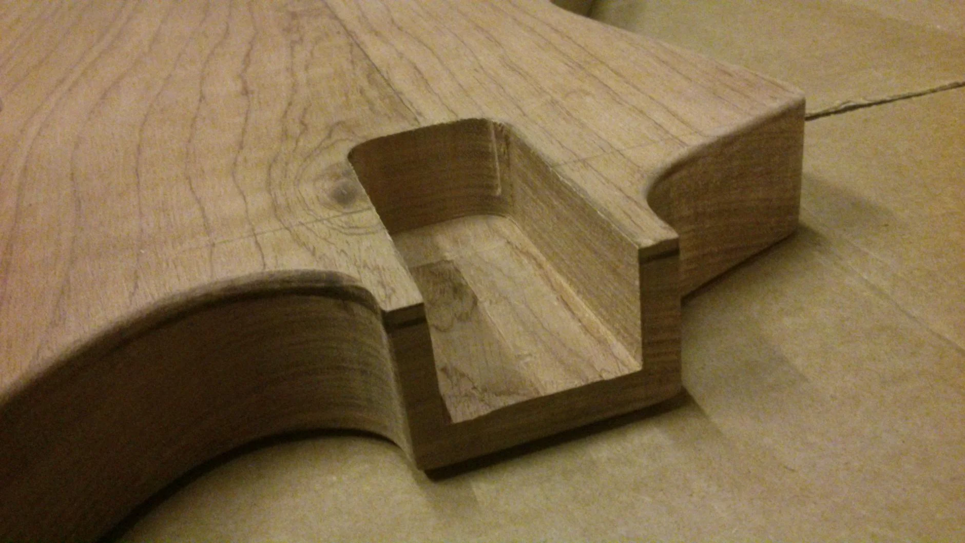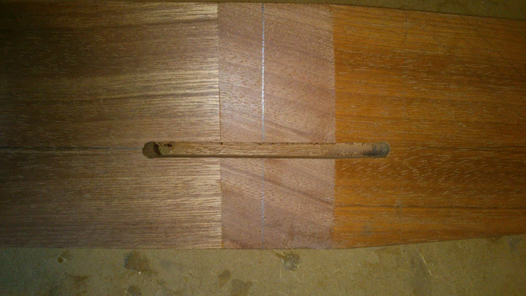 Danach war ich natürlich erstmal total gefrustet. Habe mich dann aber dazu entschieden das ganze mit einem passend zugeschnittenen Stück Holz wieder zu verschließen und den Halsstabkanal neu zu fräsen: