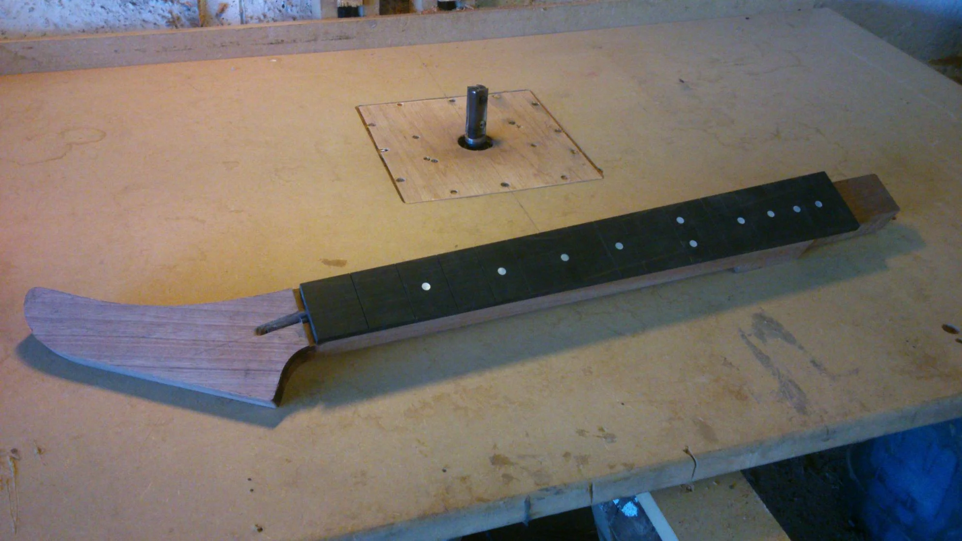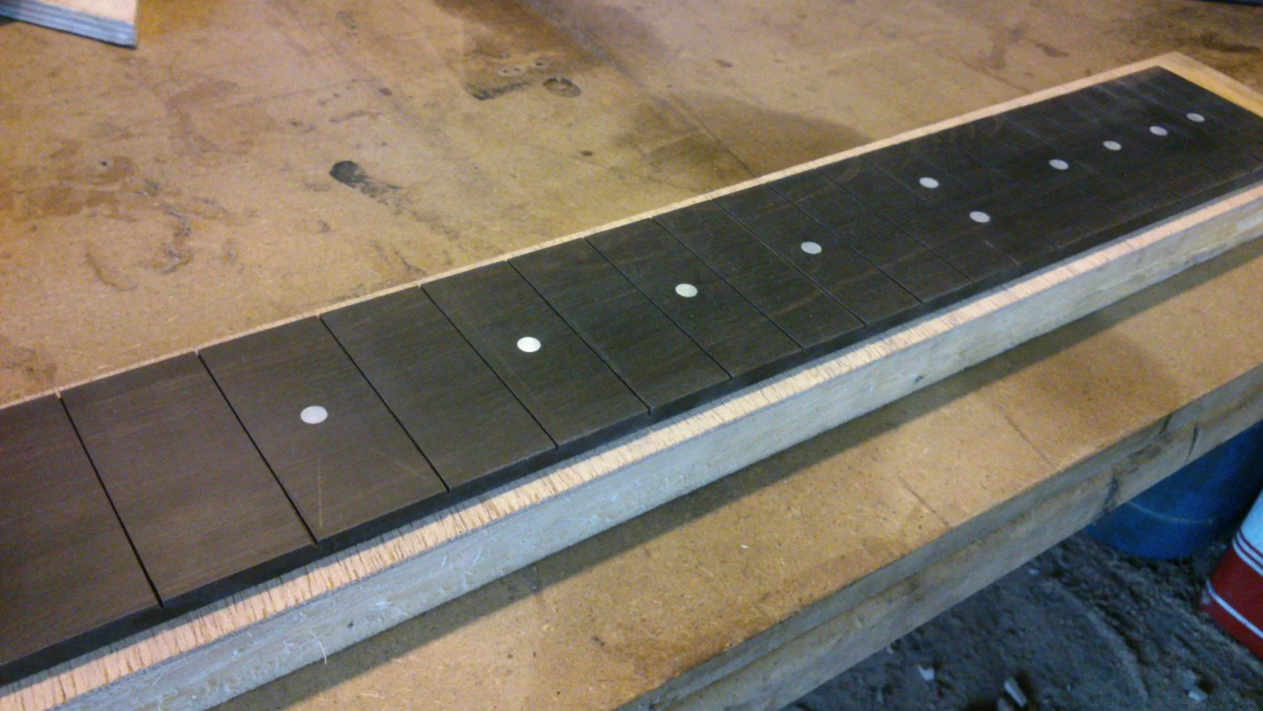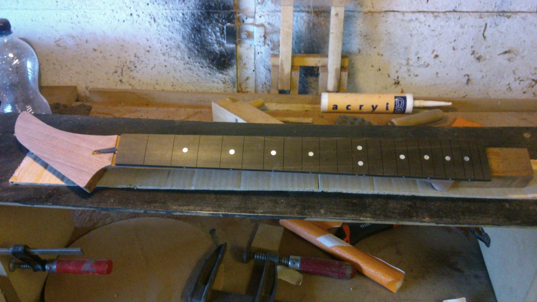 Danach habe ich den Bundschlitz neu gesägt und mit der Standbohrmaschine Löcher für die Perlmuttinlays gebohrt die ich danach mit ein bisschen Leim und einem Hammer eingesetzt habe: