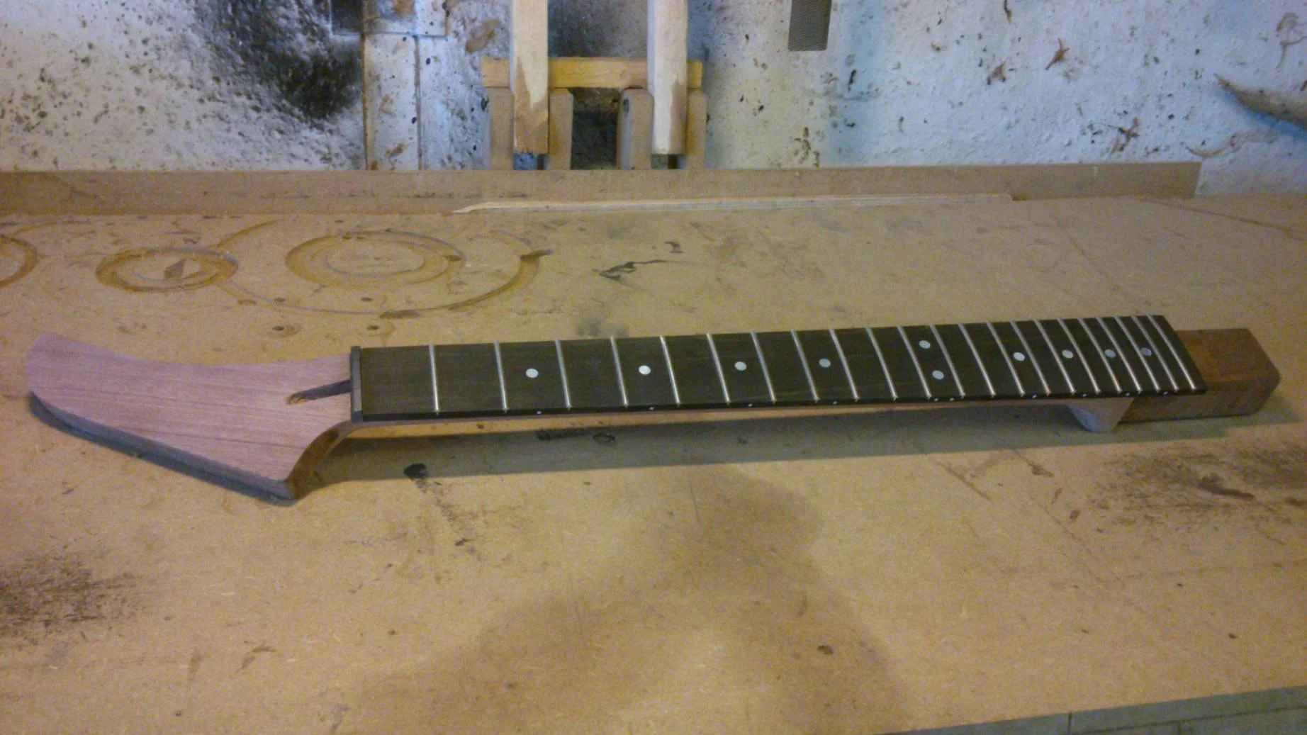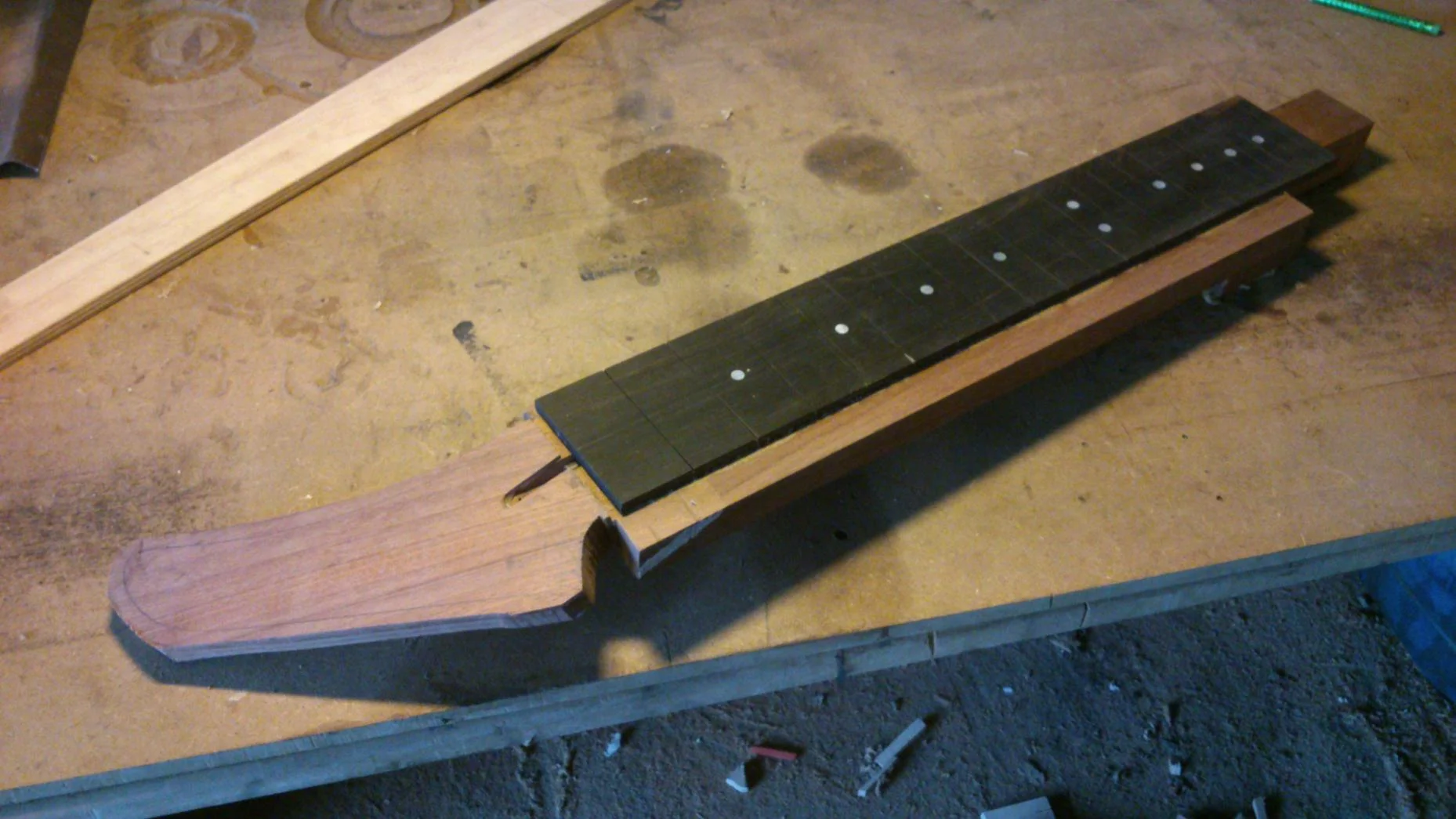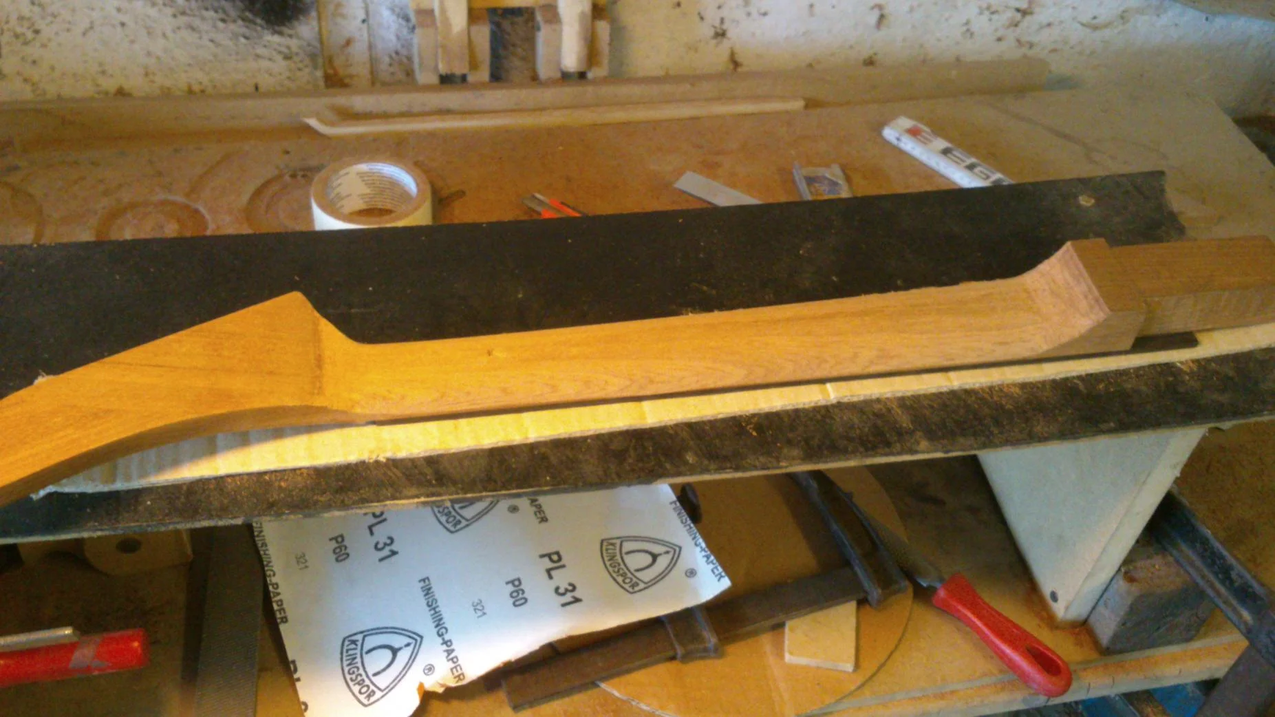 Dann habe ich die Kopfplattenform grob ausgesägt und das Griffbrett aufgeleimt: