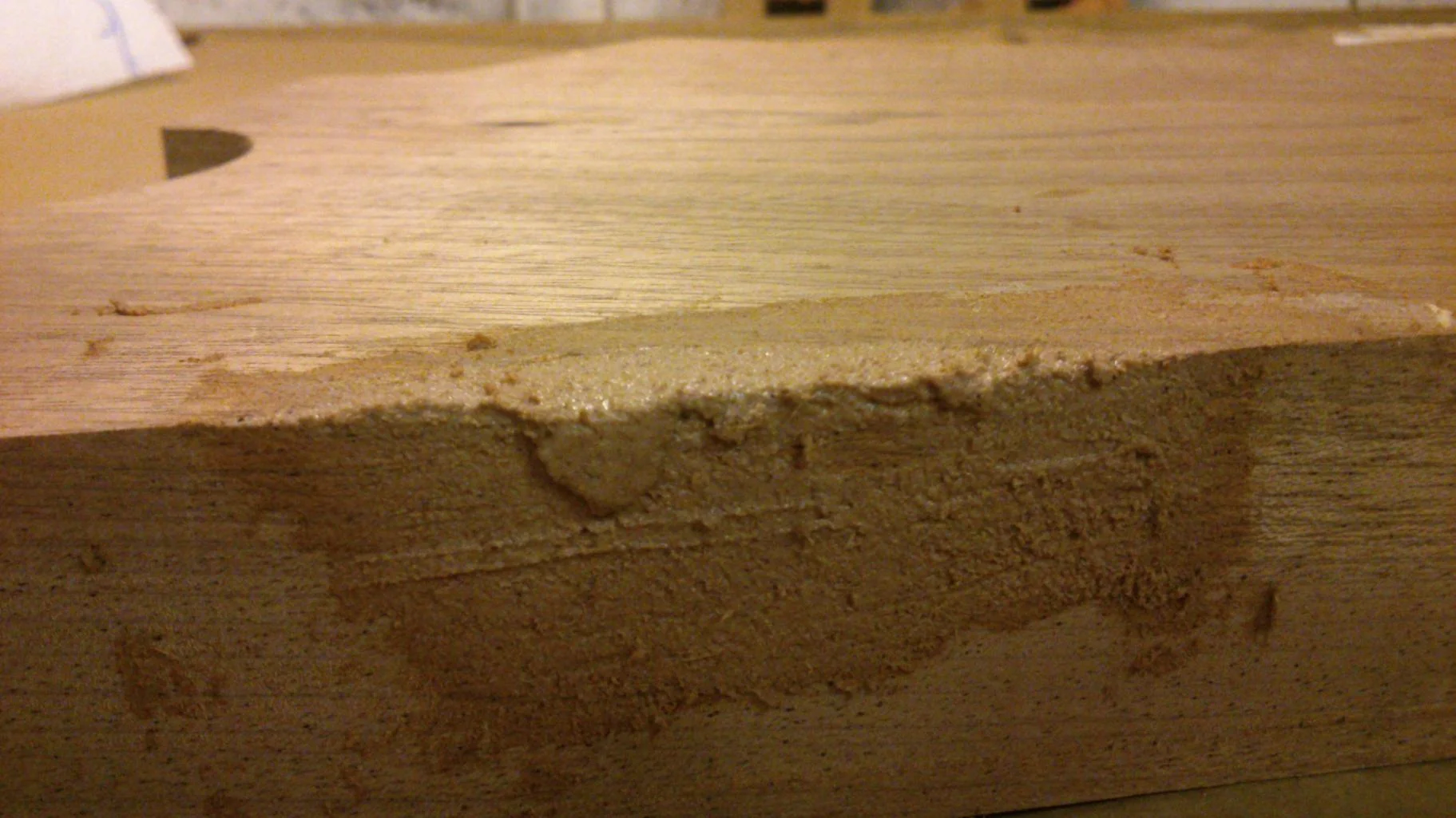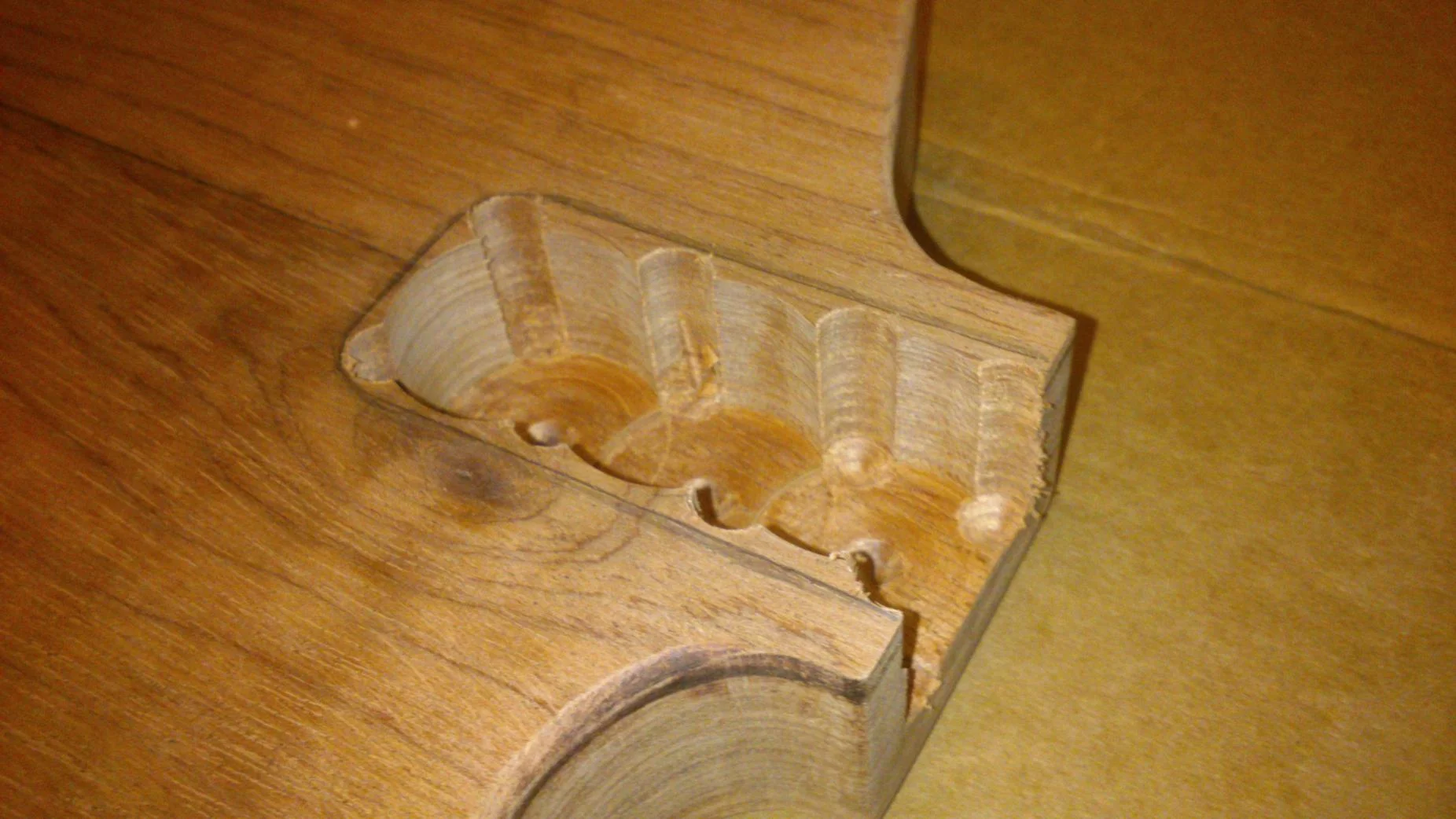Ich habe den Fräser nicht richtig in der Fräse eingespannt was dazu geführt hat, dass der Fräser langsam aus dem Futter gerutscht ist und der Fräskanal immer tiefer wurde bis mir der Fräser schließlich nach ein paar Zentimetern durch den Hals entgegengekommen ist. Aber seht selbst...