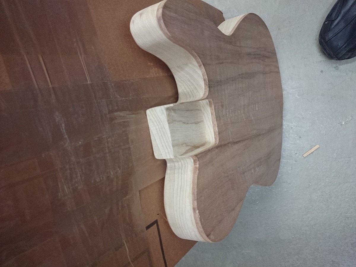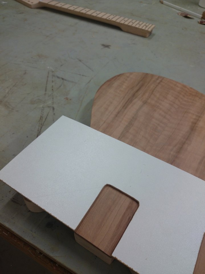 und hier ein bild von der ausgefrästen halstasche! irgfendwie finde ich den normalerweise nicht vorhandenen überrest am unteren cutaway sehr schön, vielleicht entferne ich ihn nicht und lasse ihn dran.