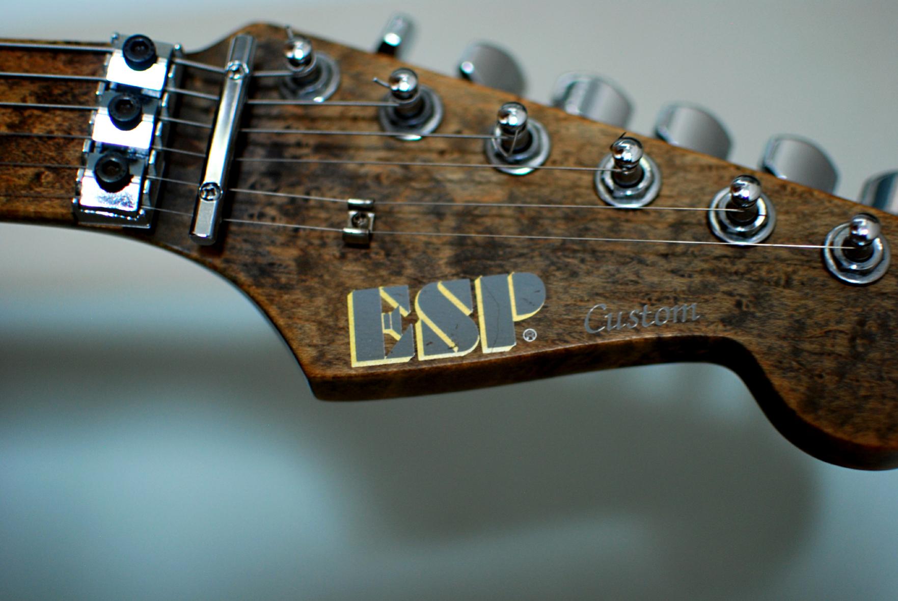 Ich kann auch ein wenig beisteuern mit Bildern von meiner ESP Custom. Die Gitarre ist seit ca. 7 Jahren in meinem Besitz, habe sie von einem Kumpel gekauft, der sie nach seiner Auskunft in Düsseldorf 1987 gekauft hat für irgendwas um die 3000 DM. Es gab da wohl mal eine "exotic wood"-Serie, zu der meine wohl auch gehört. Der Body ist Mahagoni, das Top könnte aus Koa sein, bin mir aber nicht sicher, da verschiedene Beizen aufgetragen wurden. Der Hals ist aus Vogelaugenahorn und auch recht stark bearbeitet mit Beize. Untypisch für die Gitarre ist das Floyd Rose. Ich kenne noch zwei weitere ESPs aus dieser Serie, die haben ein normales Strat Tremolo. Der schwarze Seymour Duncan Jeff Beck ist nachträglich eingebaut wurden.