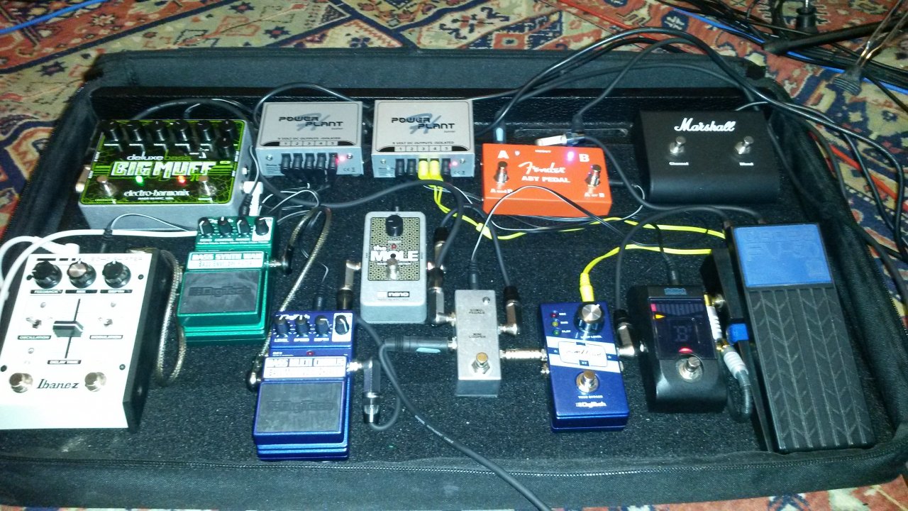 Die Fender ABY-Box benutze ich um zwischen meinen Bässen zu wechseln. Dann geht das Signal in das Volumenpedal. Über den Tunerausgng in den Korg Pitchblack und über den Ausgang in den Jamman Express. Von dort geht es weiter in den Somo Mini-Looper, und dann geht Das Signal über Mole und den Multichorus in den Basssynth, dann in den Echoshifter und zum Schluss in den Bug Muffe und wieder zurück in den Looper, bevor das Signal zum Verstärker geht.