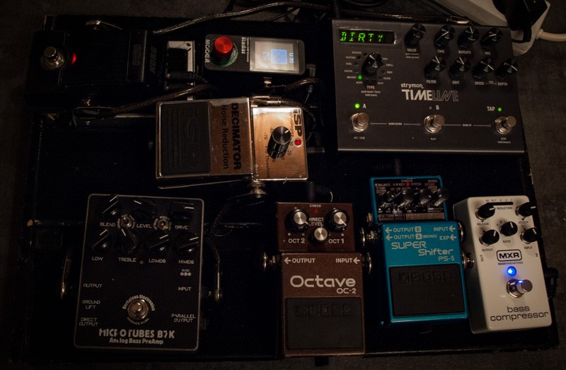 Bass->Comp->PS-5->OC-2->B7K->Decimator->Pitchblack->Delay->Radar (Cabsim, lpf, hpf, eq, Kopfhörerverstärker)