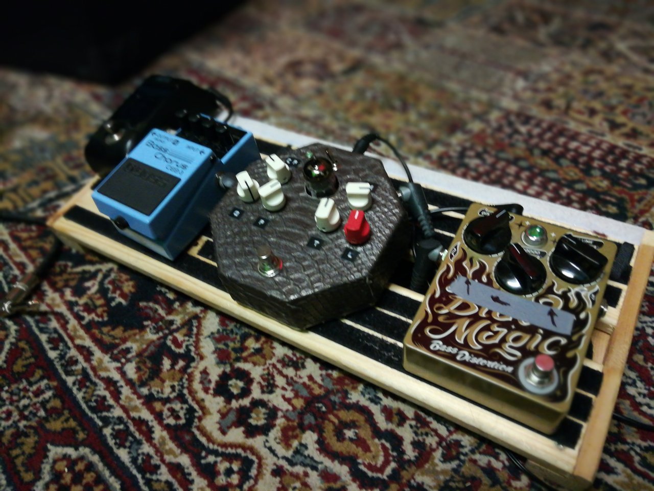 Hamer Chaparrel Bass bzw. Fender Precision -> Octaver -> Billy Sheehan <-> Funk Lite im Drive Loop <-> Beta DLX (fast immer an) -> FuzzMo -> Apollo -> Ditto (nur für zu Hause).