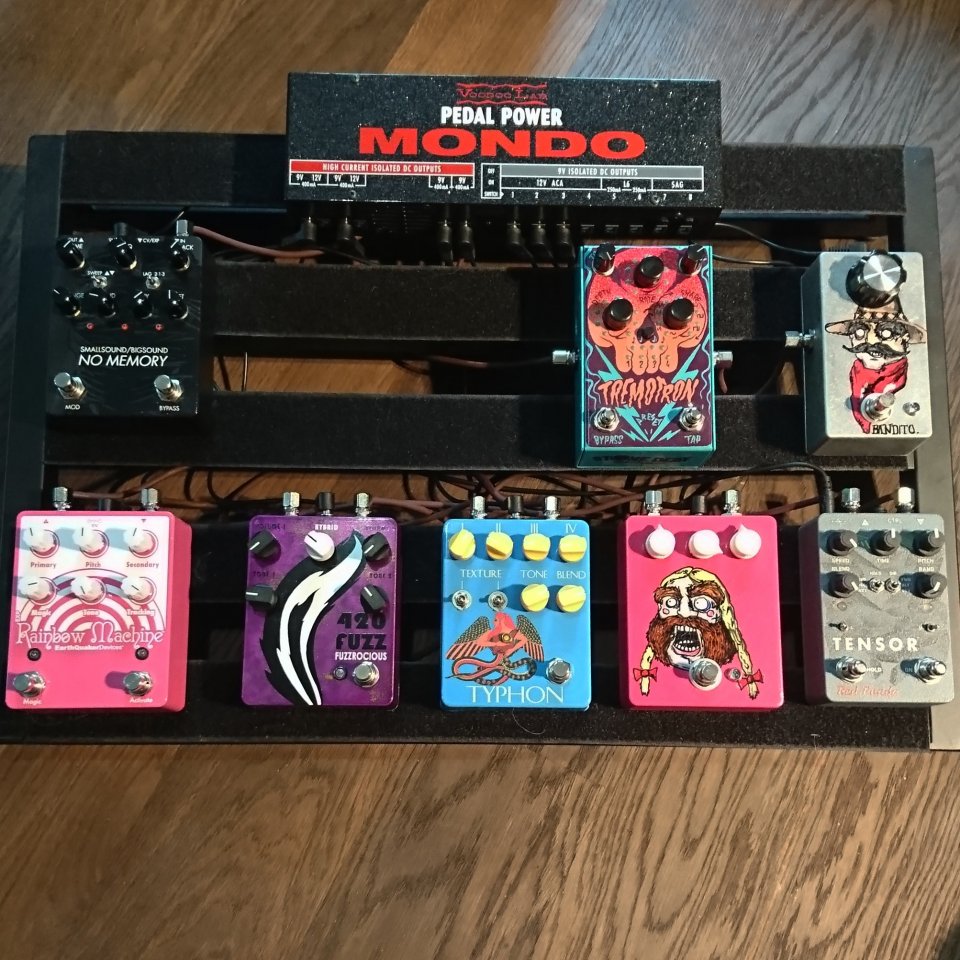Grundgerüst ist das Harley Benton Spaceship 60 und gefüttert werden die Treter vom HB Iso-2 Pro. Vorher war auch mal kurzzeitig der große blaue Klotz vom Harley drunter, da hat‘s bei mir aber oft gebrummt. Vermutlich hab ich dem Teil mit seinen 500mA einfach zuviel abverlangt..