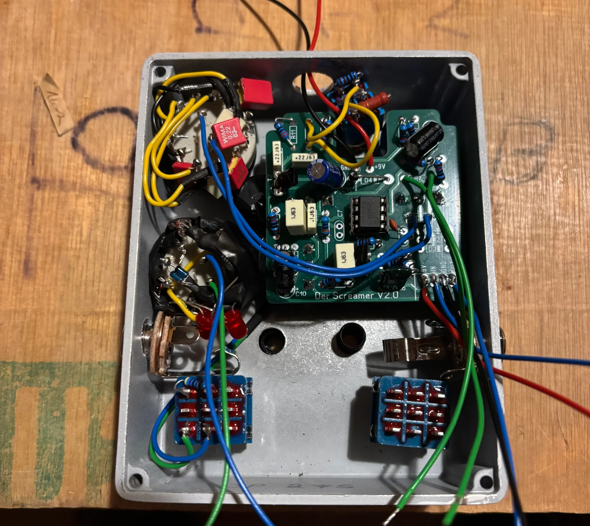 Mal schauen, was das wird. Der obere Drehschalter wechselt den Cap für den MIttennock. Statt Stock 0,047uF geht es in 6 Stufen von 0,033uF bis 1uF. Die Werte hab ich von hier unter dem Abschnitt "Mid-Hump Tone Mod" geklaut und die Frequenzsprünge wirkten mir sinnvoll: https://beavisaudio.com/projects/screamerlab/