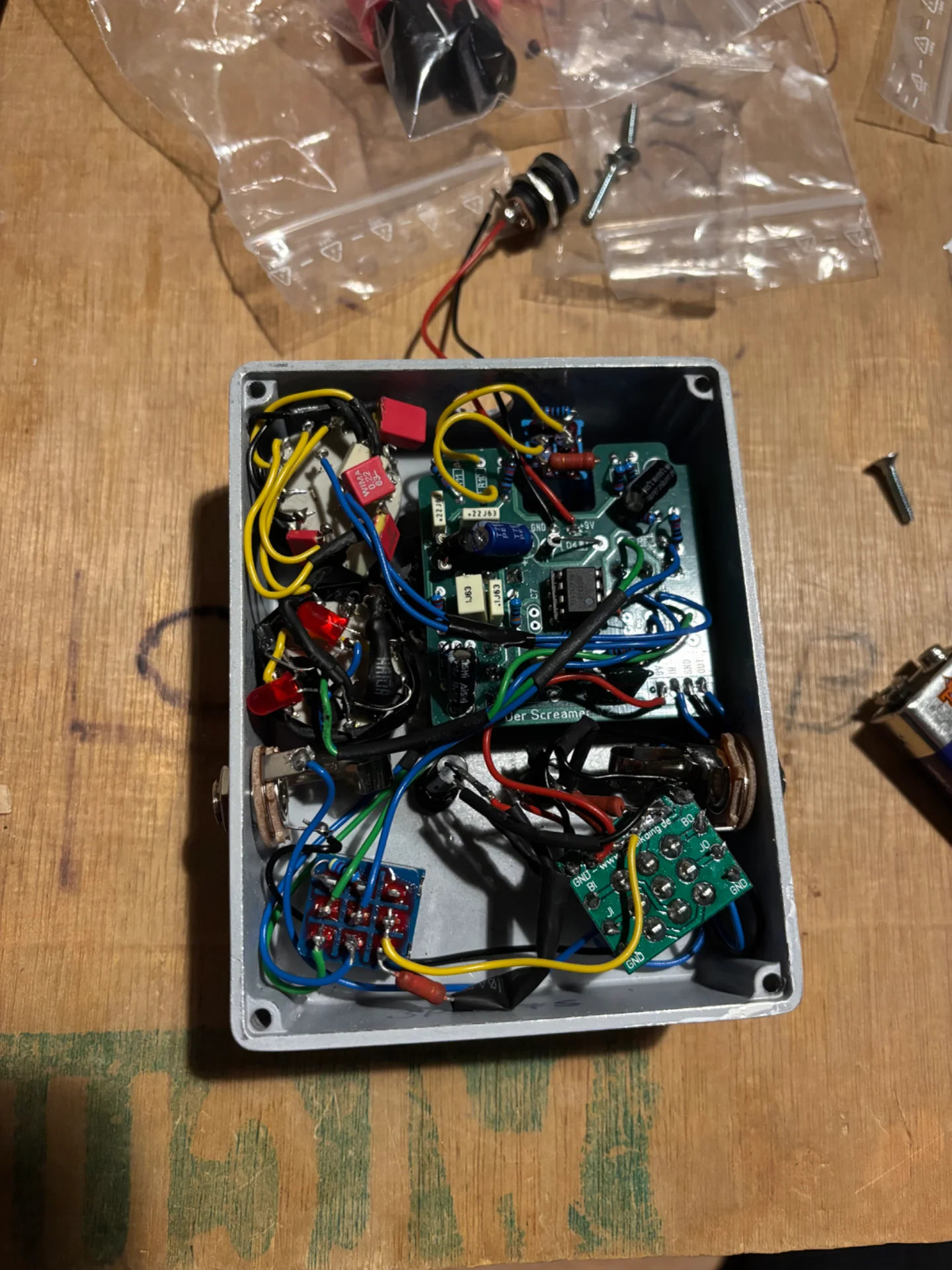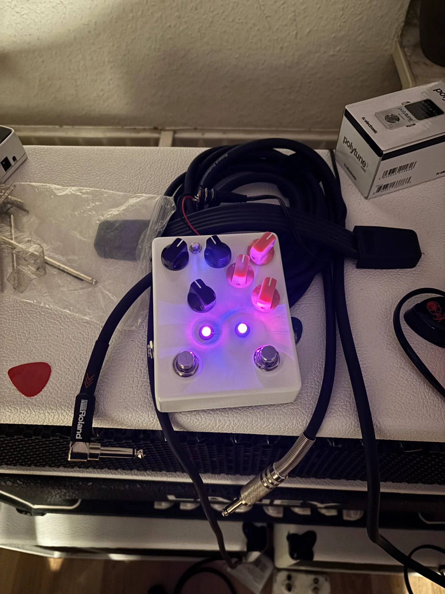 Den Distortion-Boost Mod hab ich von verlinkter Seite ebenfalls verbaut. Und der Schalter oben-mittig bei der Platine sollte den Regelweg des Tone-Potis erweitern, quasi ein Höhenboost. Mal schauen, was das taugt, vor allem bei sehr tiefen Tunings.