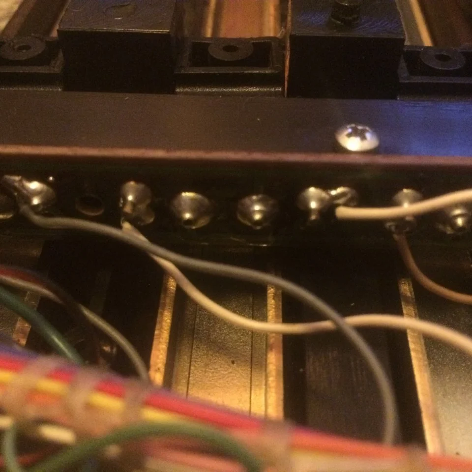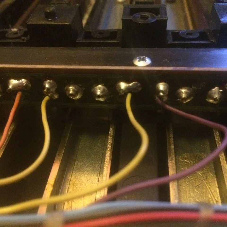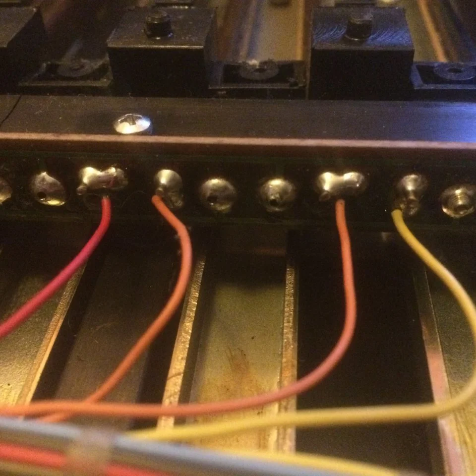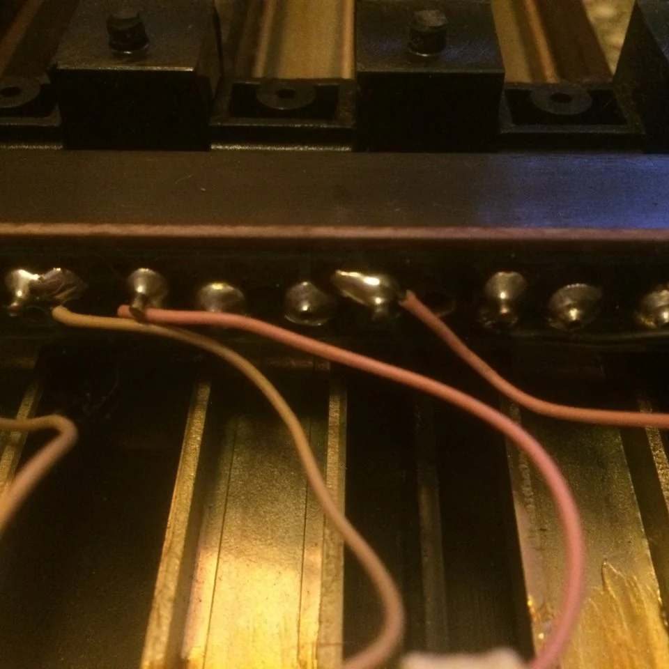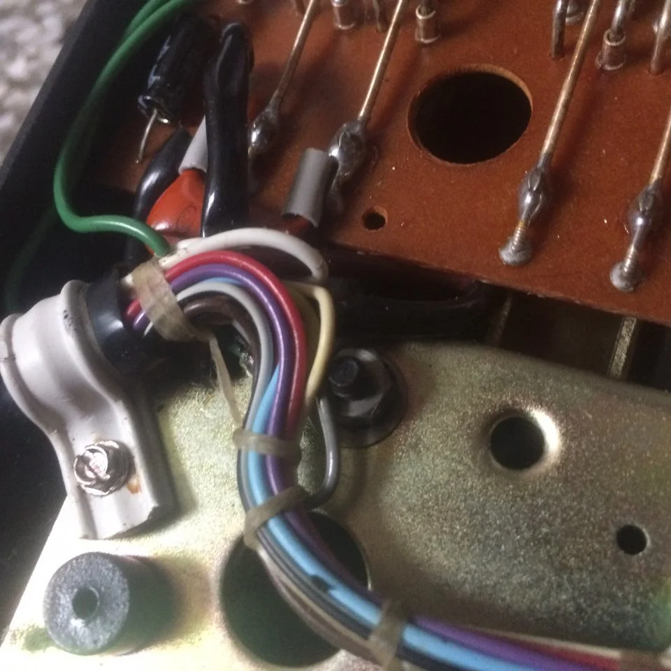 Das Pedal ist aus einer alten Farfisa Heimorgel und die Kontakte kommen in 2 Kabelbäumen heraus. Auf jedem Kabelbaum führen je 2 Kabel zu zwei Lötstellen, womit, ich vermute, ein einfacher Schalterkontakt hergestellt wird.
