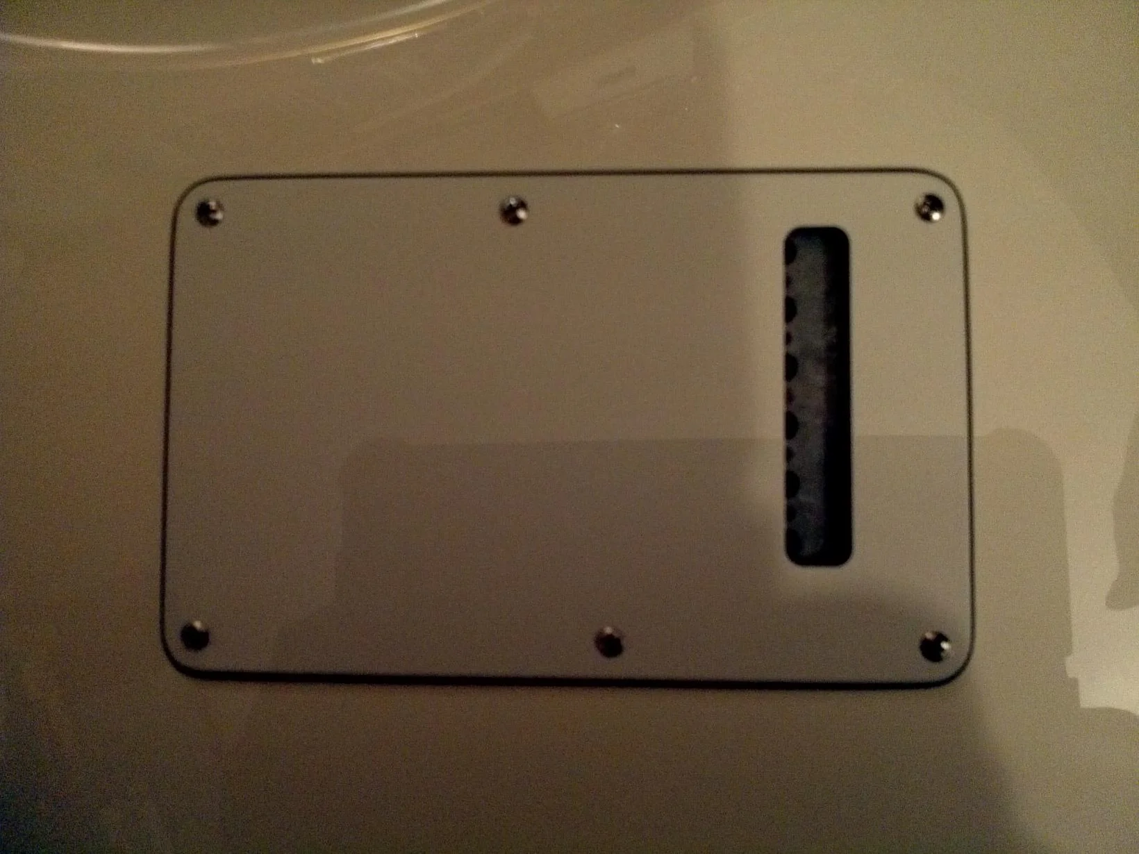 ich habe mir vor 2 Wochen beim Musicstore eine neue Fender Standard Strat gekauft. Als ich dann vorgestern die Werkssaiten gegen neue tauschen wollte ist mir aufgefallen, dass der Deckel an der Rückseite der Gitarre so montiert ist, dass es kaum möglich ist die Saiten zu wechseln, ohne die Abdeckung zu demontieren. Ich denke allerdings, dass das so nicht sein sollte. Damit ihr sehen könnt habe ich mal ein Foto davon gemacht wo man hoffentlich erkennen kann was ich meine.