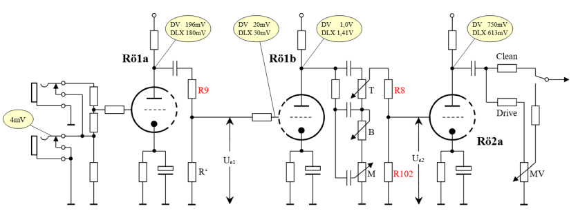 Die Eingangswiderstände der nachfolgenden Röhrenstufen vernachlässige ich ebenfalls, wenn ich die Spannungsteiler betrachte. So ganz koscher ist das nicht, zugegeben. Denn so rechne ich mit unbelasteten Spannungsteilern, die in Wirklichkeit aber belastete sind eben aufgrund der Eingangswiderstände der Röhrenstufen. Da diese aber beim Blues DeVille und Blues Deluxe konstant bleiben, mag man mir diesen Fauxpas vielleicht verzeihen.