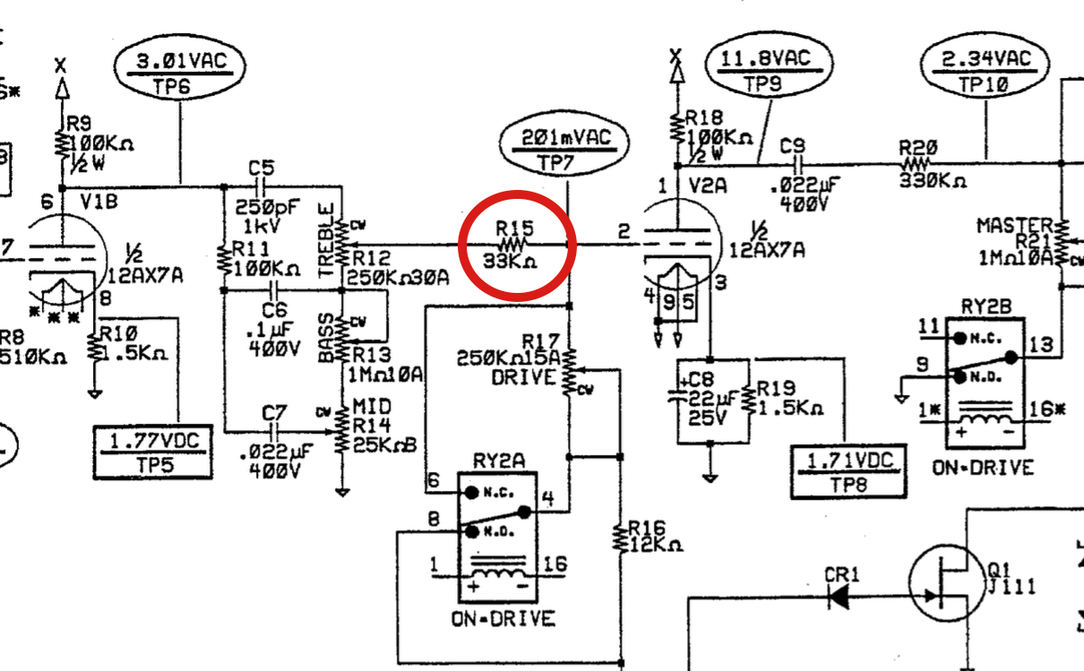 * DeVille: R8 wurde erfolgreich ausgetauscht (33KΩ gegen 220KΩ), um die Wirkung seines Tonestacks zu verbessern. Funktioniert bestens.