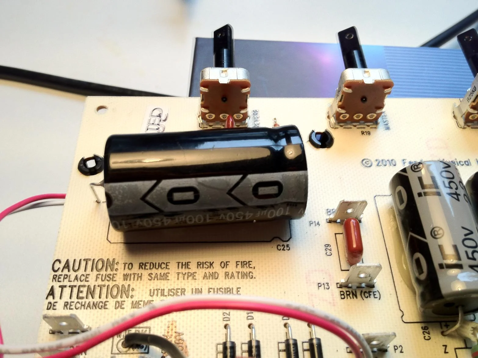 2. Ein neuer Elko für die Stromversorgung. Der 47uf Elko war etwas knapp bemessen so ging im beim Palm Muting oft die Puste aus. Dieser wurde durch einen 100uf Elko ersetzt.