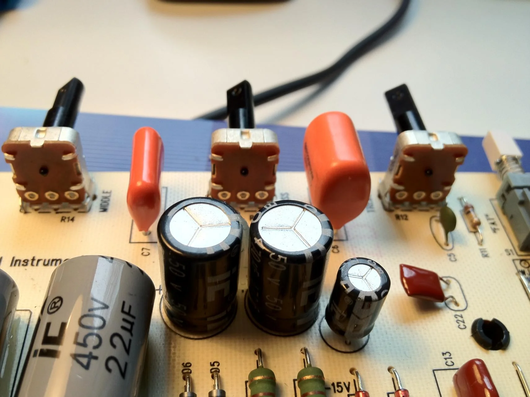 3. Modifizierung der Tonblende. Den Kondensator der Bass Stufe habe ich durch einen 100nf - und die der mitten durch einen 4.7nf Orange Drop Kondensator ersetzt.