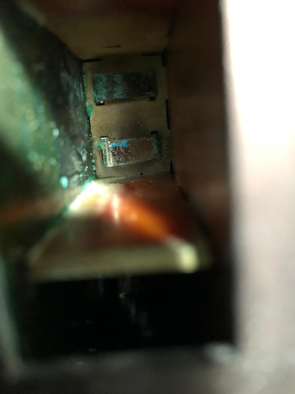 3. es ist mal ein 9V Block drin ausgelaufen, Kontakte bis zum Kupfer grün belegt ... Seitenwände angeätzt, auch nicht das, was ichbei "alles funktioniert" unbedingt vorausgesetzt hätte. ohne Reinigung in den Tiefen des Faches kein Kontakt