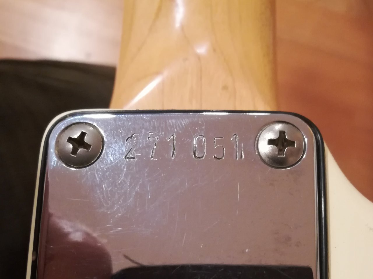 ...die Seriennummer von der Metallplatte, wo der Hals angeschraubt ist, eingegeben hatte, wurde mir doch etwas mulmig. Ich hatte "American Made" angeclickt und der Dater spuckte eine US Strat aus dem Jahr 1969 aus.