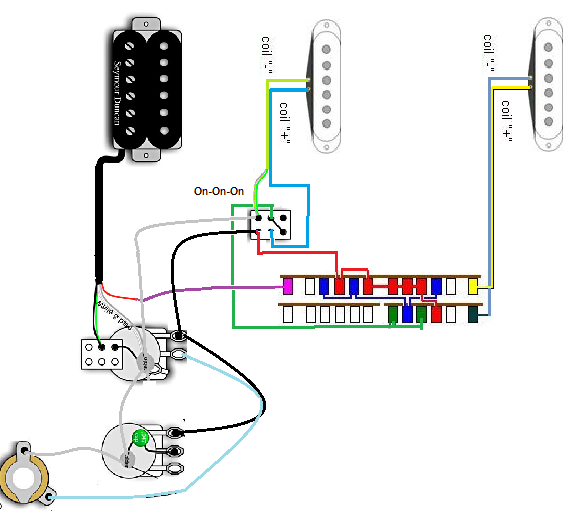 Der Plan ist also die selbige obere Tele Schaltung über den 5 Weg Schalter zu verdrahten und den Middle PU über einen On-On-On Schalter jeweils zu einer 5 Weg Schaltposition zuzuschalten.