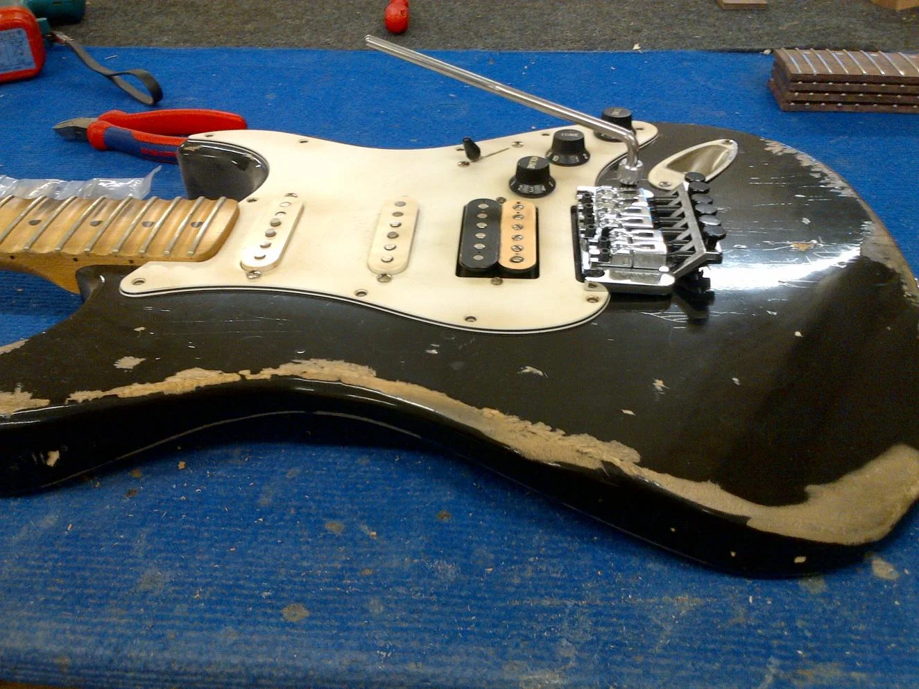 Ich würde trotzdem eher abraten. Das fängt schon beim Griffbrettradius an, der bei den meisten Strats viel kleiner ist als beim FR, d.h., das Griffbrett ist stärker gewölbt. Das Dumme ist, dass man die Saitenreiter beim Floyd nicht einzeln in der Höhe verstellen und damit an die Griffbrettwölbung anpassen kann. Du läufst also Gefahr, dass hinterher entweder die mittleren Saiten schnarren oder die äußeren Saiten zu hoch über dem Griffbrett liegen. Beim FR ist der Radius 12" oder sogar flacher, bei einer Vintage Strat 7,25" und bei einer American Standard Strat und vielen anderen 9,5". Letzteres kann man wohl gerade noch erreichen, wenn man Shims (Unterlegbleche) unter die mittleren Saitenreiter schraubt, allerdings ist dann der Radius für die A- und die H-Saite nicht ganz rund. Außerdem kann man am anderen Ende, dem Klemmsattel, gar nichts ändern. In aller Regel sind FR-Gitarren halt ab Werk schon auf diese Gegebenheiten hin konstruiert, was bei einer Strat nicht ohne weiteres der Fall ist. Oder die Hersteller ordern umgekehrt FR mit Spezialmaßen, die man im Handel erst mal finden muss.