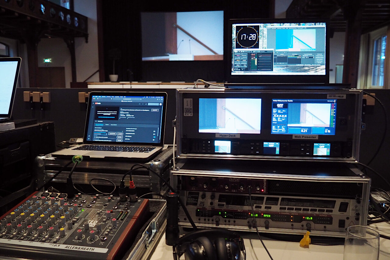 Was ist das denn für ein schickes Uhrenwidget auf dem Laptop im unteren Bild?Zwei FOHs von unter der Woche nachgereicht, am Dienstag war ich „Hauptler” an PTZ-Kameras und Live-Bildregie, den Ton machte ein junger Mann vom Uniradio, das war nen Hybrid-Talk zum Super Tuesday… am Mittwoch dann eine Kandidatenvorstellung einer Oberbürgermeisterwahl, ich als „Subler”, da war ich neben dem Setup für solide Übertragung und konsistente Stream-Lautstärke zuständig… beide Schnappschüsse von vor der Show.