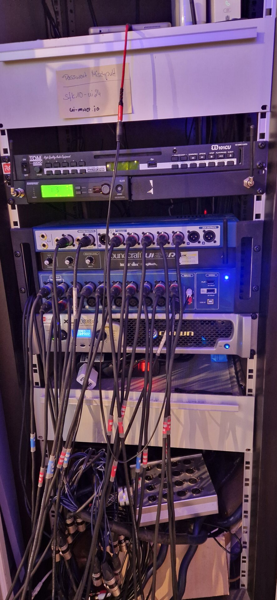 Ach ja, die Stagebox hab ich tatsächlich erst entdeckt, als ich alles verkabelt hatte. Die Stagebox war nicht auf der Bühne sondern im Schrank, wo auch das UI24 eingebaut war (siehe Foto). Unterm Strich hätte sich aber nicht viel geändert. Da ich nur meine 5 und 10 Meter Kabel mitgenommen habe, wäre ein kürzerer Weg nur wenig besser gewesen.