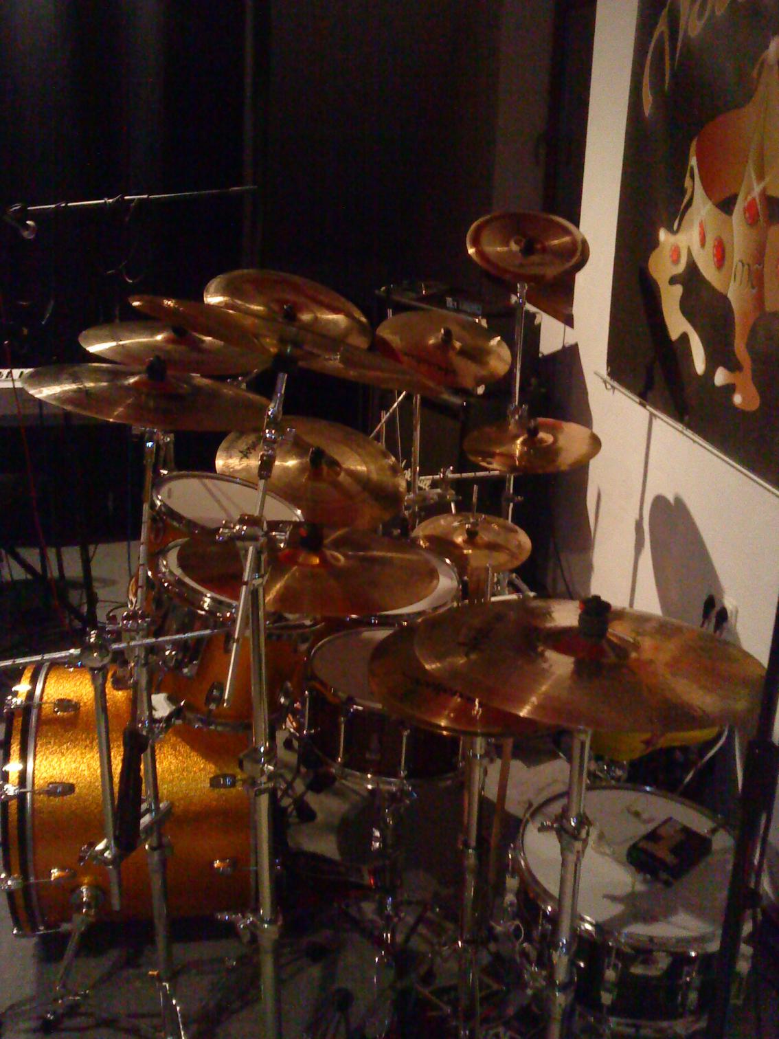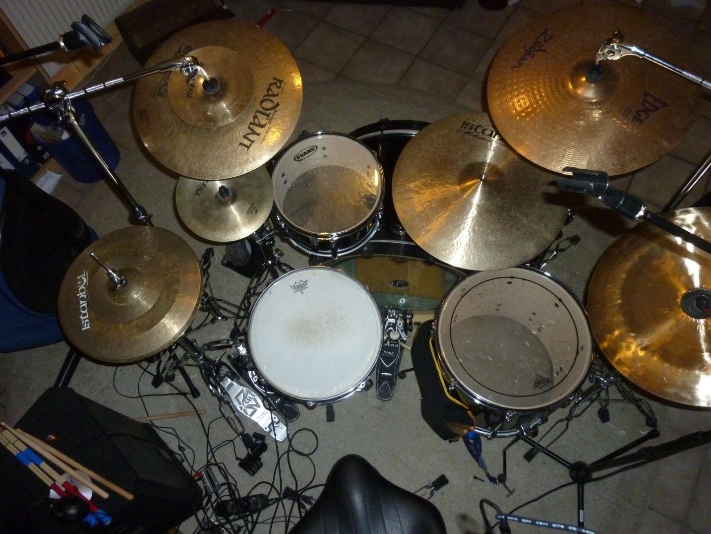 Ich habe noch ein aktuelles Handy-Foto von fast allen meinen Becken (es fehlt das 20" Power Ride) - leider ist die QualitÀt nicht so doll. Auf jeden Fall wird es diese Konstellation so schnell nicht mehr geben, da ich ab nÀchster Woche nur noch mit Minimalausstattung spielen werde. Das Zeugs auf dem Foto ist mir einfach viel zu viel! :eek: