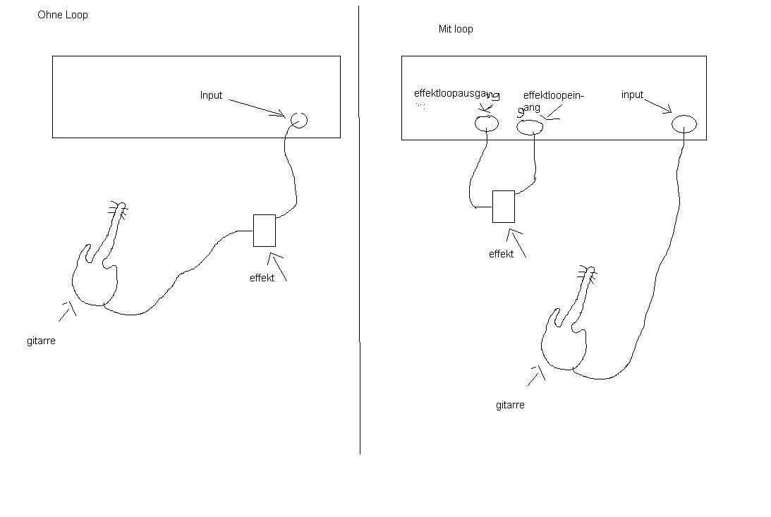 Eine effektschleife befindet sich an den meisten heutigen amps (meist erste ab ende 80er). Das ist ein ausgang aus der Vorstufe und ein Eingang in die Endstufe.