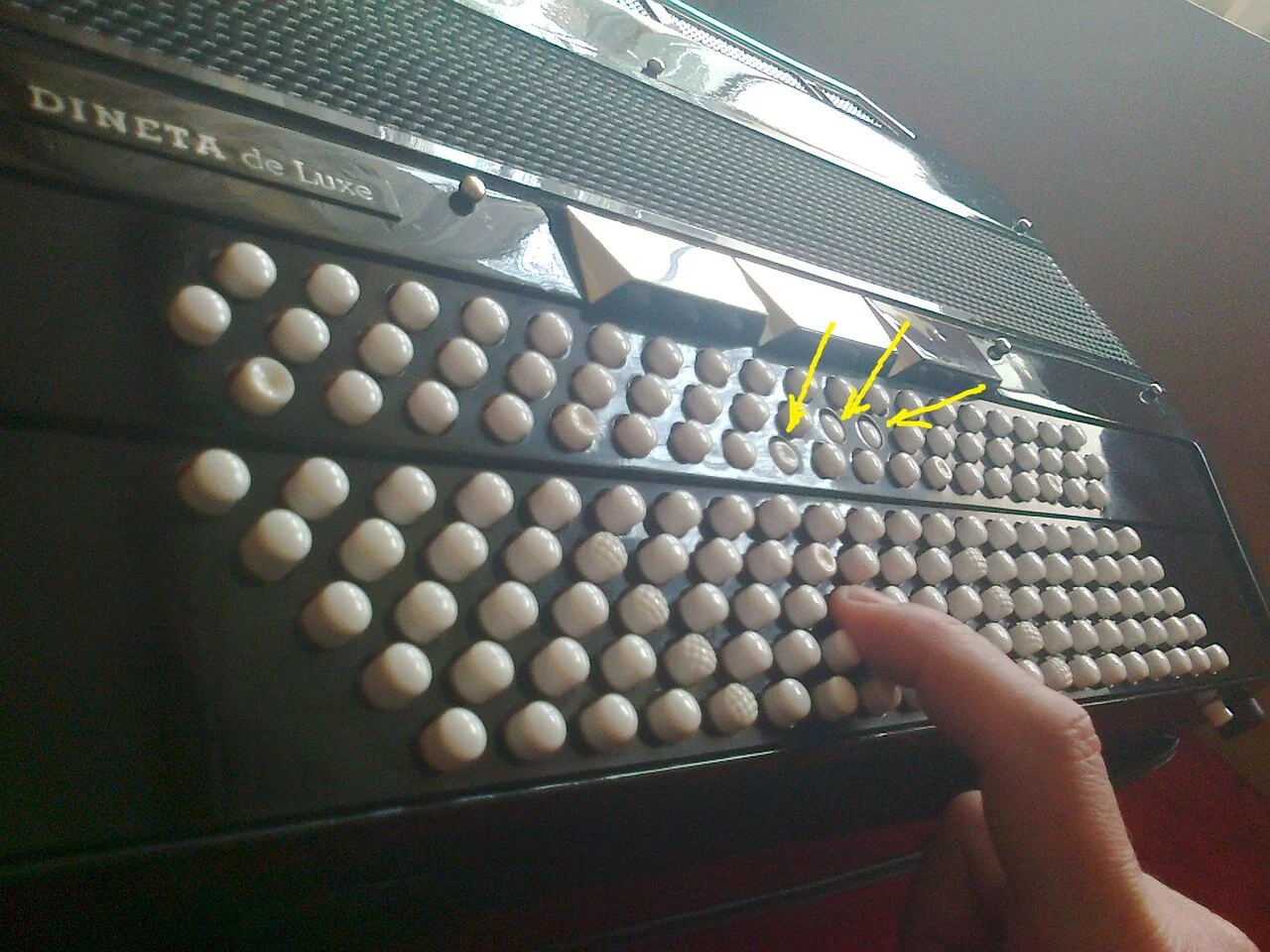 Das ist völlig egal . Erst wenn zuvielel Töne glecihzeitig gedrückt werden und damit sehr viele Fderhebel gedrüct sind, haben entsprechend sehr viele andere Knopfschieber keine Rückstellfeder und können sich innerhalb ihres Bewegungsspiels frei bewegen und drehen... und dann kann es vorkommen, dass dann die Schieber mit ihrer Auskragung am Federhebel vorbeirutschen und dann hinter den Federhebel rutschen. Dann fehlt die Rückstellkraft des Federhebels der den Bassknopf wieder hochdrückt und der Bassknopf fällt ein. Und zwar nicht nur der eine, sondern alle Knöpfe die sich auf diesem Federhebel direkt oder indirekt mit abstützen. Und wenn das ein heftigerer Ruck war, speziell seitlich kommend, dann kann das mitunter schon mal das gesamte Bassfeld betreffen.