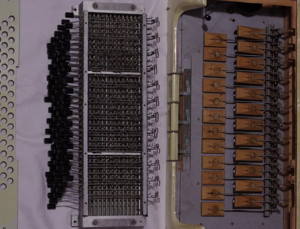 in der Mitte ist der komplette Mechanikblock wo die Verteilung auf die verschiedenen Töne erfolgt.