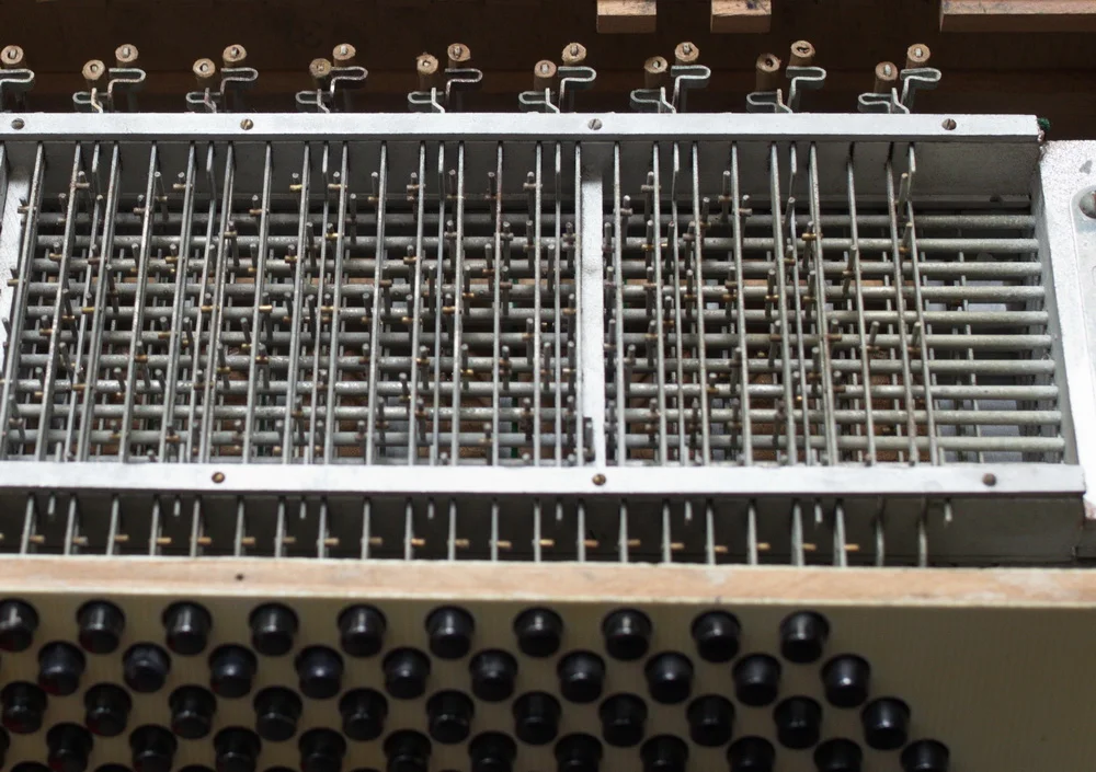 Drückt man einen Akkordbass, dann geht der nicht direkt durch bis auf die Federhebel, sondern hat diverse Mitnehmerstifte, die über die eingreifenden Mitnehmerdrähte ein paar der darunterliegenden Wellen.