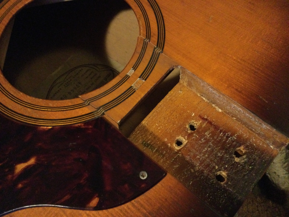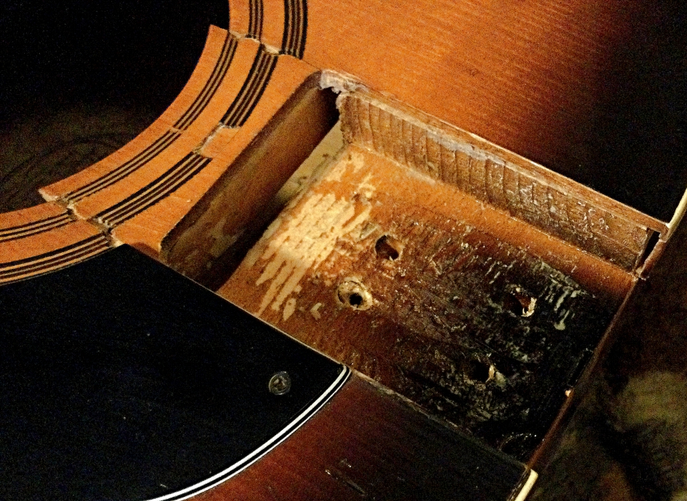 Die Beschädigung am Schalloch (Bild 1 und 2) ist ja deutlich zu sehen. Ist euch ein solcher Schaden schonmal untergekommen ?