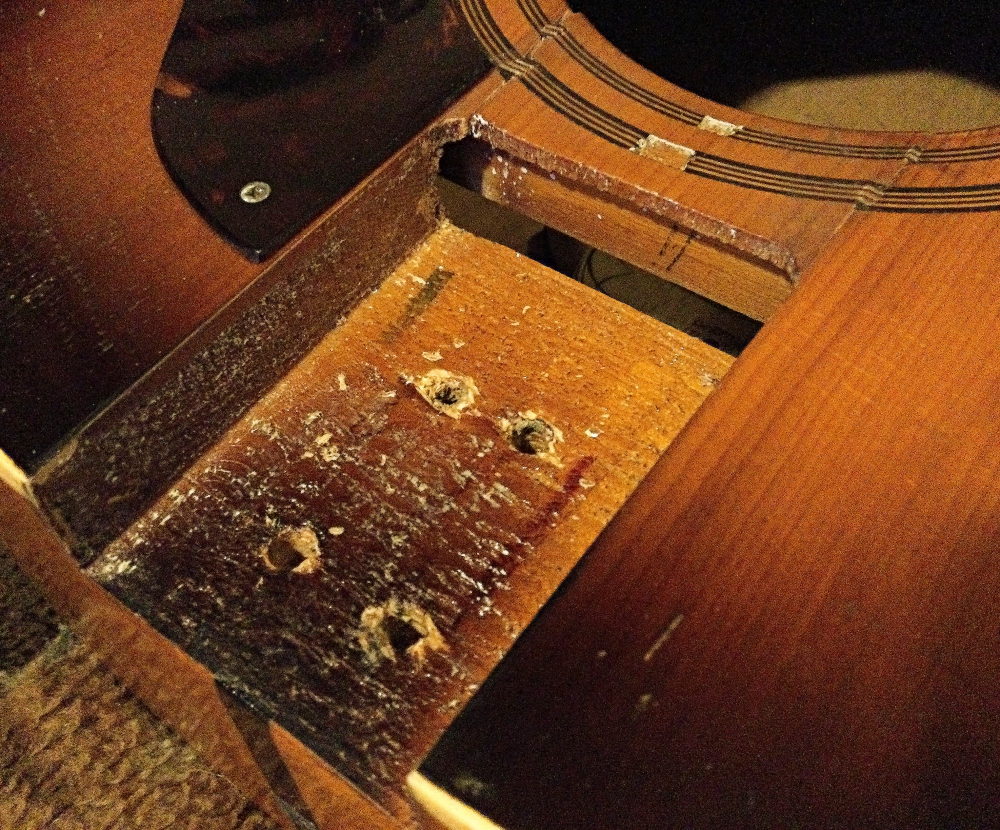 Der Halsblock (der Holzklotz im Korpus in dem der Hals verschraubt wird) scheint nicht lose zu sein, weil es keinerlei Anzeichen von Rissen in Zarge, Boden oder Decke gibt.