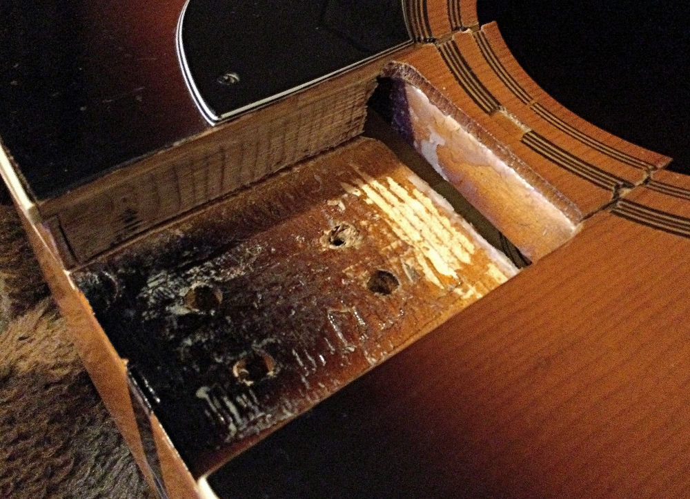 Man könnte vermuten, dass der Hals unter Saitenspannung gelöst wurde, dann sollte aber der Schaden am Schalloch eher ins Innere des Korpus gedrückt worden sein.