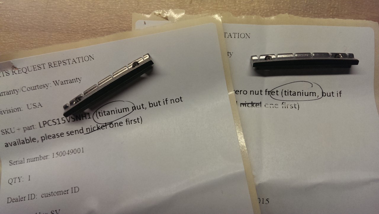 Ja,........das sind beides Titaniumsättel. Der Einbau ist ebenfalls ganz easy. Ich habe es ein paar Seiten schon mal gepostet wie ich da vorgegangen bin. Dauert ca. 5 min.........mehr nicht. Auch die Einstellung des Sattels ist einfach. Da kann man sich ruhig selber herantrauen. Da kann man nichts kaputt machen.......Die Messingteile werden definitiv nicht lange halten...........kommt natürlich ganz darauf an wieviel man mit der Gitarre spielt.....