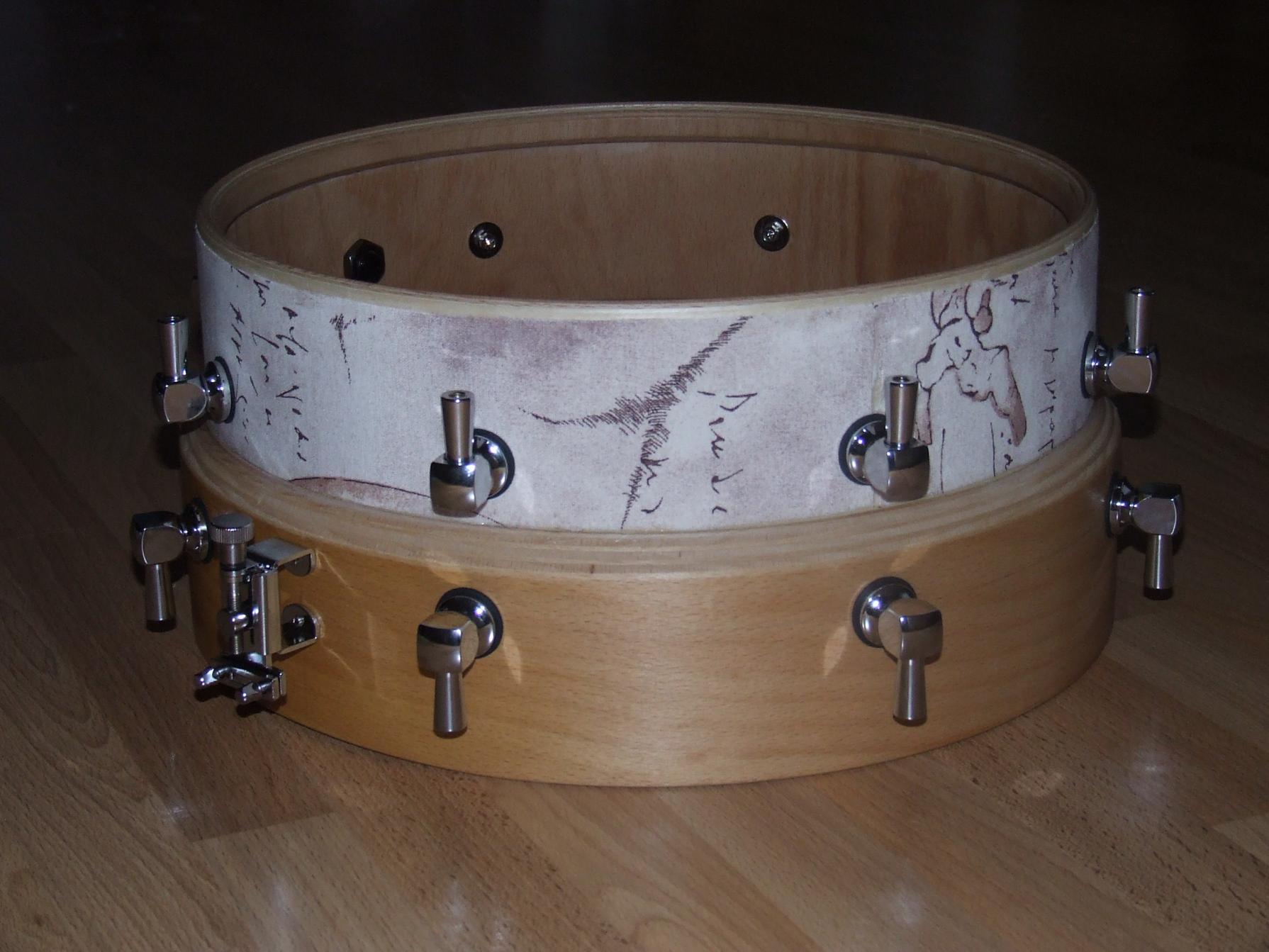 Schlagfell 13", Resofell 14" Oben ein dünner 13" Ahorn/Buche-Kessel mit Verstärkungsring, unten ein 13mm 14" Buchekessel.