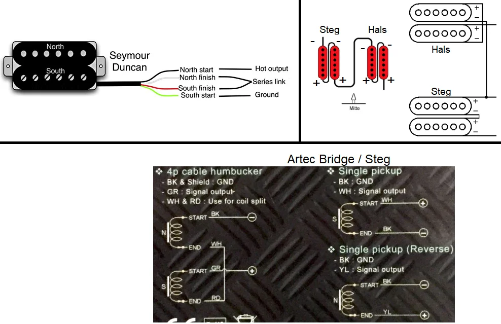Es bringt doch nix, sich über irgendwelche Kabelfarben und Start/Finish-Definitionen die Rübe zu machen. Das RWRP-Prinzip muss klar sein. Wenn man dann die PU hat, nimmt man eine der 4 Spule als Referenz und schließt die anderen 3 in beide Richtungen mal seriell an.Was stimmt jetzt nun? Eines der Beiden muss doch falsch sein?