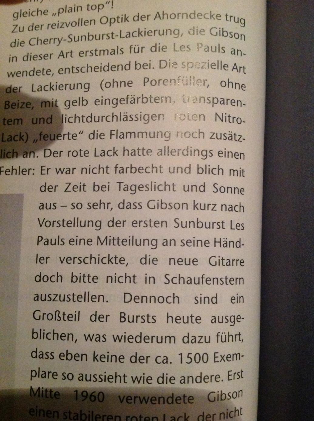 Keine Paula hat einen klassischen Porenfueller auf der DECKE! Das macht auch keinen Sinn, da Ahorn ein NICHT-offenporiges Holz ist und dementsprechend auch nix verschlossen werden muss. Der Mahagoni-Ruecken/Hals/etc. bei Gibson heute und auch damals haben selbstverstaendlich einen Porenfueller drauf (da Mahagoni ein offenporiges Holz ist). Gibson verwendet fuer das Mahagoni einen eingefaerbten Fueller, der dann zumeist nur noch mit Klarlack versiegelt wird. Warum Rebellius beim Mahagoni die Flammung hervorheben will, ist mir allerdings nicht wirklich klar geworden. Fuer mich ganz klar ein Fall von schlecht uebersetzt und dann einfach uebertragen.