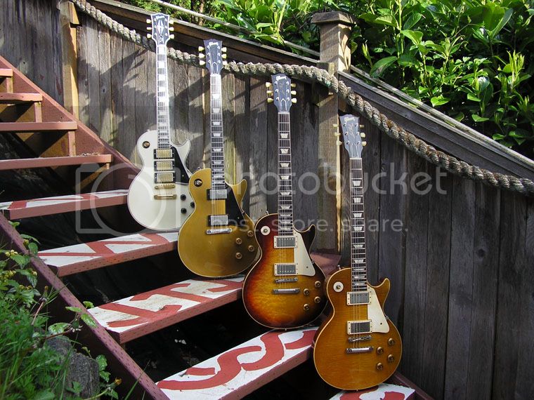 Du hast da wirklich vier für sich eigenständige Les Pauls. Die Goldtop die du dir selbst gebaut hast sieht extrem schick aus. Interessant ein 1954er Modell mit schwarzen Plastiks gesehen. Sieht auf jeden Fall anders und interessant aus.