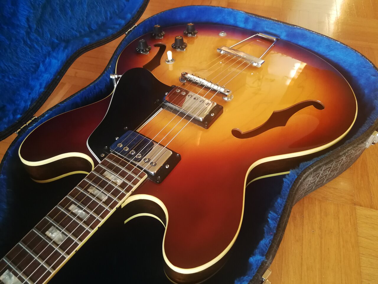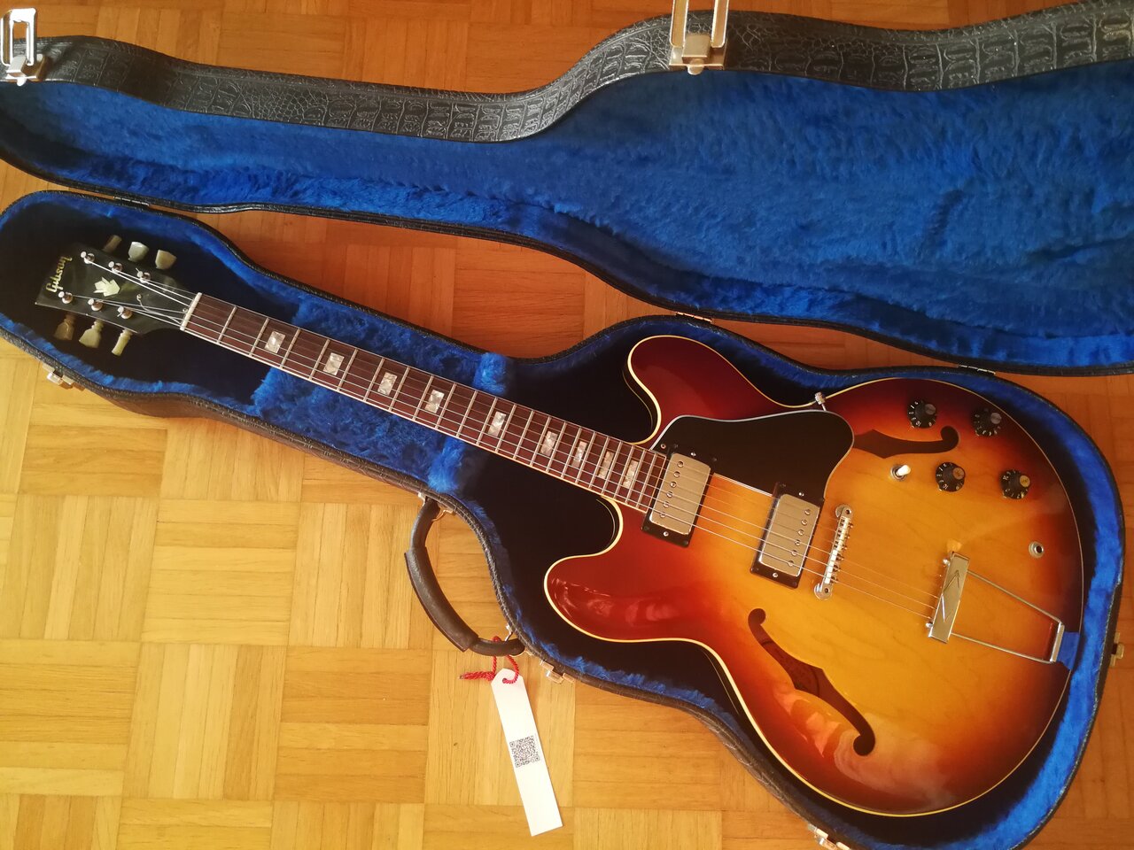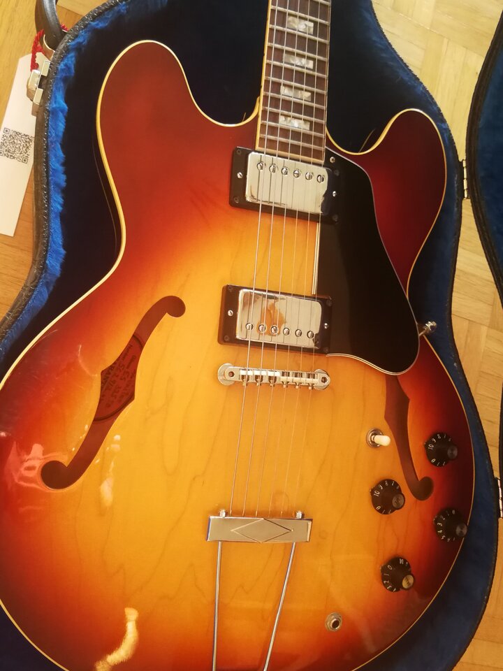 Gibson ES-335 TD ich glaube Ice Tea Burst Baujahr 1969. Nicht die 2016 aufgelegte 69er Memphis Reissue. Zustand: ja wie neu.Originalzustand mit zeitgemäßen Case! Mein bestes Pferd im Stall... Very sweet!
