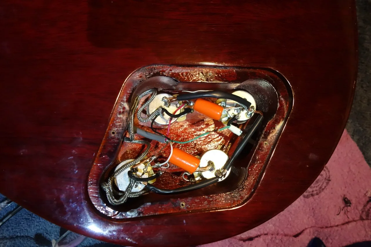 Erstes Problem, ich habe so ne blöde Platine drin. Habe mir als Austausch PU die Seymour Duncan Slash PU´s geholt. Leider hatte ich da wenig Zeit mich mit zu beschäftigen, wollte die einfach nur erstmal ausgetauscht haben. Deswegen beim Thomann schnell einbauen lassen, aber leider hat der Mitarbeiter die Platine drin gelassen und die Pickups einfach an die Platine angelötet. Schade, dachte, er muss es eh komplett rausschmeißen. Jetzt ist halt die Platine noch drin. Heißt, ich brauche bis auf die Pickups eigentlich alles.