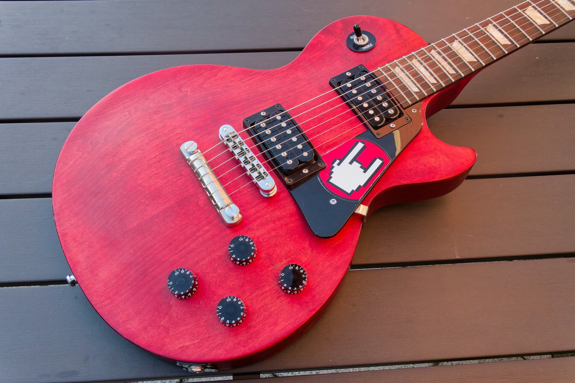 Auch war sie die erste Gitarre, an der ich etwas experimentiert habe. Messing-Brücke, Alu-Tailpiece, Suhr DA-Humbucker,... aber immer noch die originale Platine. 🙈😅 Aber das ändere ich vielleicht doch irgendwann noch mal auf 50s-Wiring. 🙂