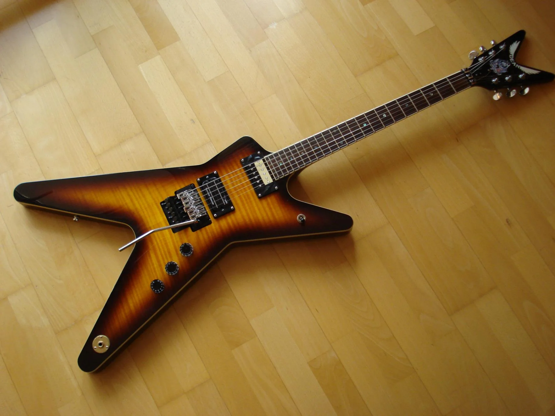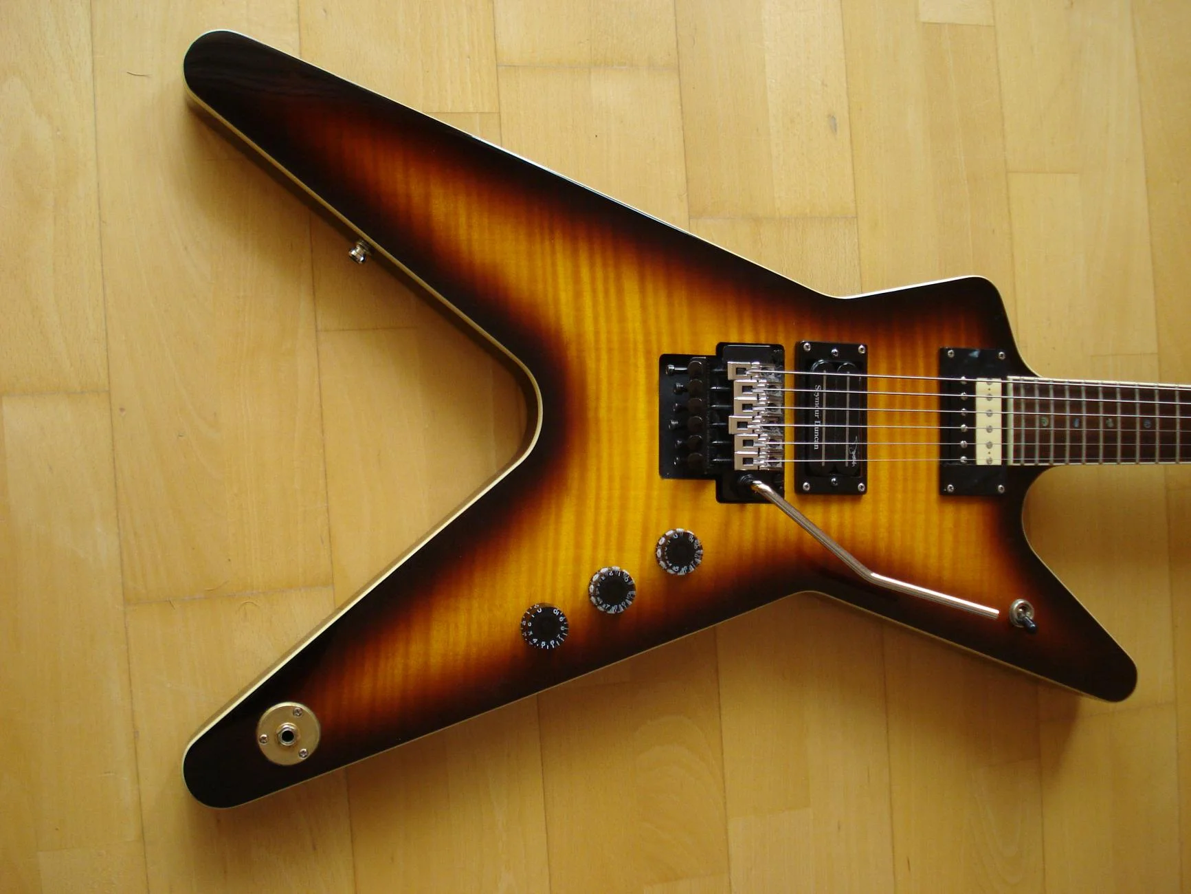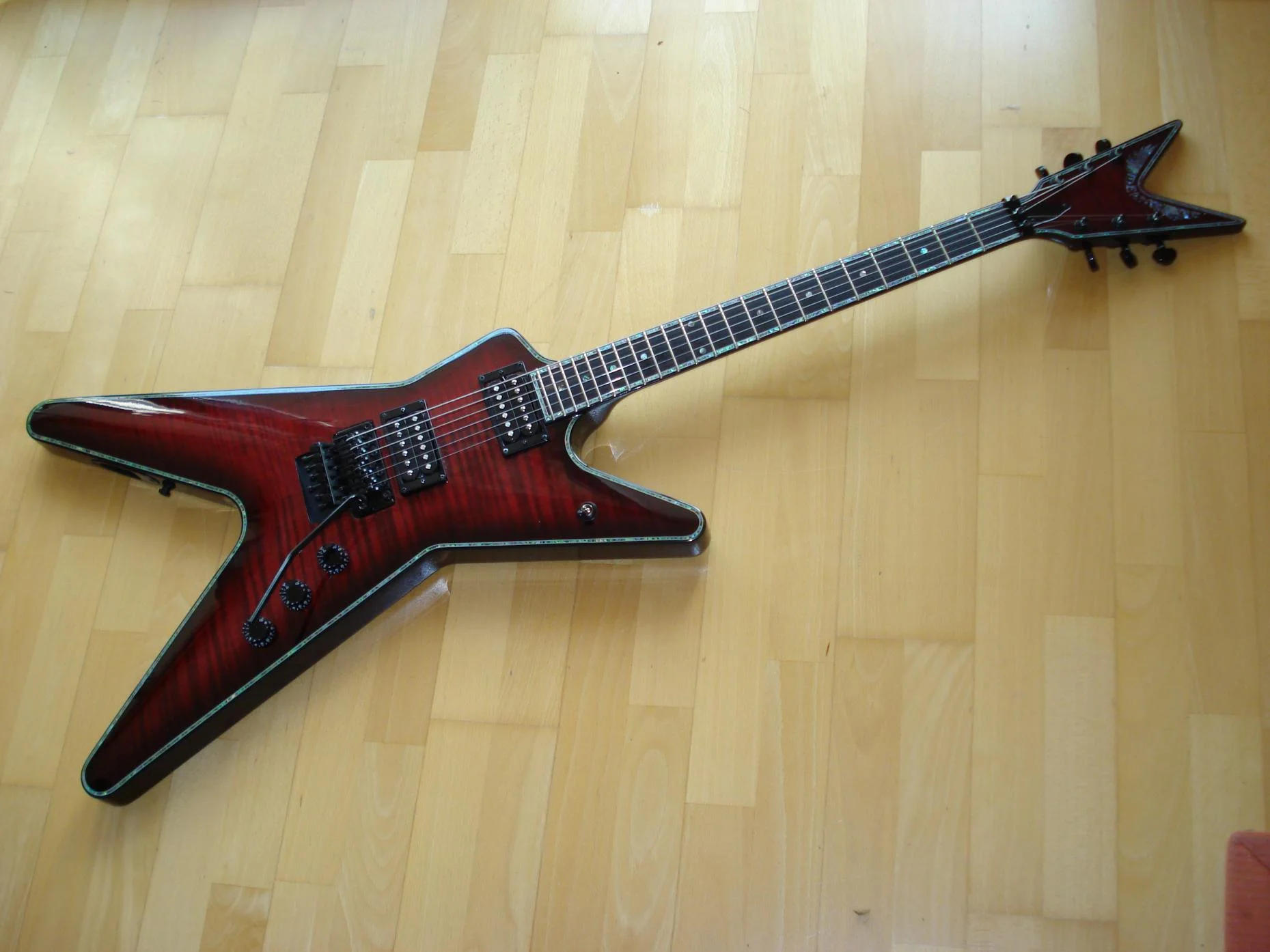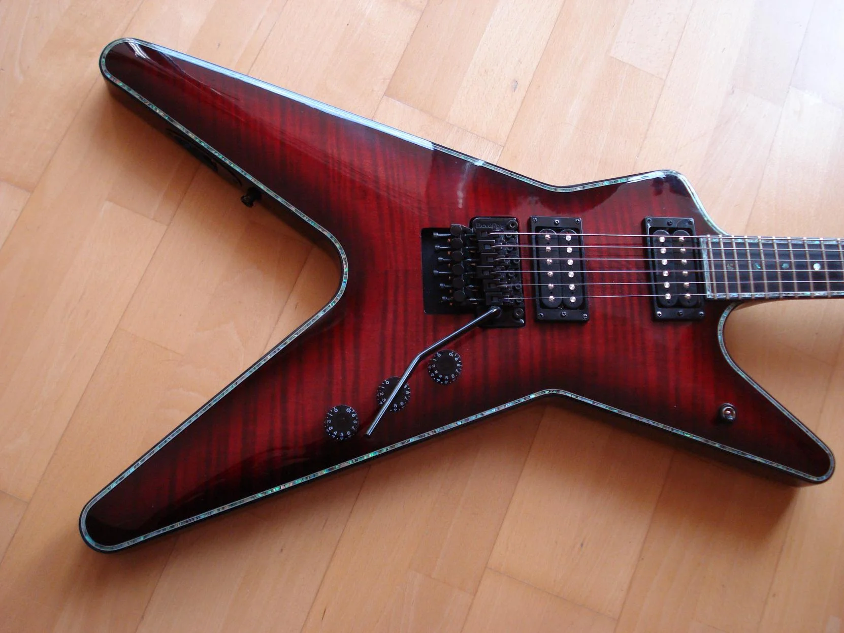 Die FBD ist perfekt ausbalanciert, die ATF ist minimal kopflastig. Ich habe aber drei Wochen gebraucht um das zu bemerken und außerdem habe ich einen sehr glatten Gurt dran. Fällt also kaum ins Gewicht. Leichtgewichte sind sie allerdings beide nicht. Wer vorher eine Stunde mit einer Gibson-V oder so rumgeturnt ist und sich dann eine ML um den Hals hängt, merkt den Zug der Schwerkraft gleich etwas deutlicher. Ich war ja schon immer der Meinung, das eine Gitarre gefälligst Zacken haben muß aber wer bisher eine Gitarre mit ergonomisch perfektem Shape gespielt hat, wird mit dem durchgehend über 4 cm dicken Body eventuell erstmal zu kämpfen haben, insbesondere mit dem oberen Flügel. Wie der rechte Arm da aufliegt ist schon gewöhnungsbedürftig denke ich. Die Kante des Flügels drückt einem schon etwas in den Unterarm. Der Hals ist bis zum 20. Bund sehr gut bespielbar, für die beiden letzten Bünde muß man sich schon etwas mehr strecken. Höher als bis zum 17. Bund kommt man mit dem Daumen nicht. Das original-FR der ATF lässt sich merkbar feinfühliger bedienen als das Lizenz-FR der FBD. In punkto Stimmstabilität nehmen sich beide aber nichts, soll heissen: stimmen muß man selten.