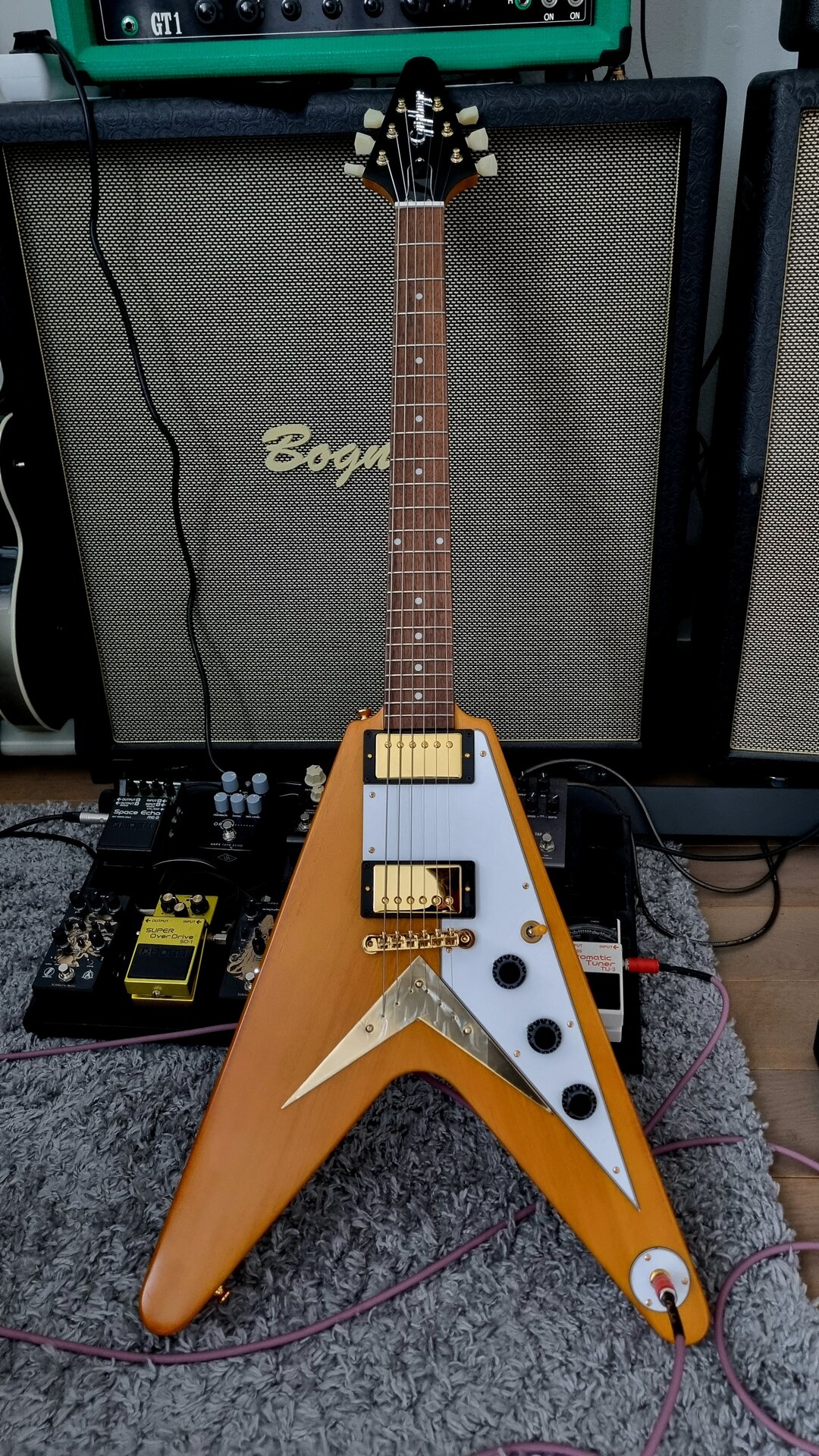 Auch etwas angefixt durch diverse Videos im Netz und die letzte Rabattaktion von Thomann habe ich dann mal die Epiphone 58 Korina Flying V inspired by Gibson Custom geordert.