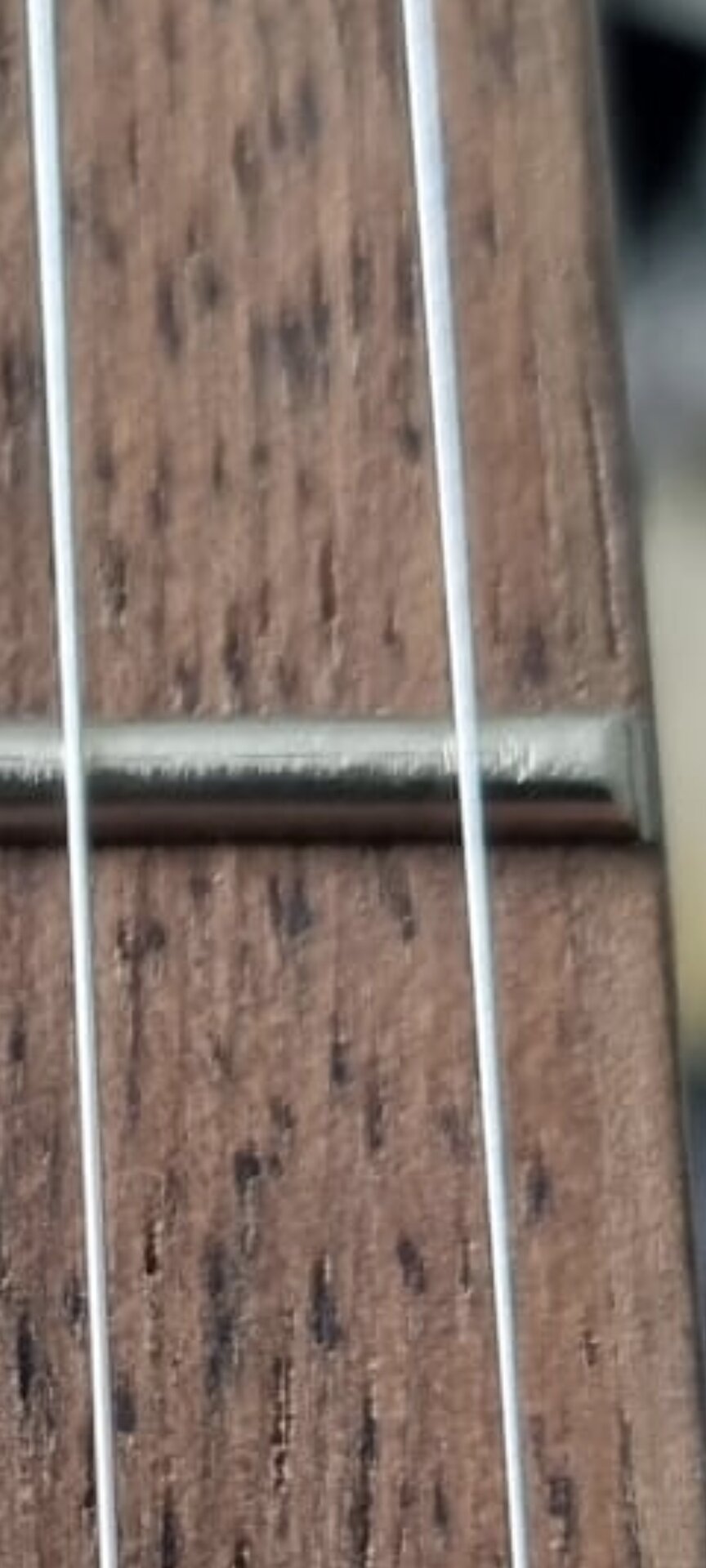 Schlecht polierte Bünde habe ich erwartet und das wäre ich auch bereit gewesen noch nachzupolieren. Im vorliegenden Fall sind die Bünde aber darüberhinaus einfach zerdengelt. Macken, Kerben…