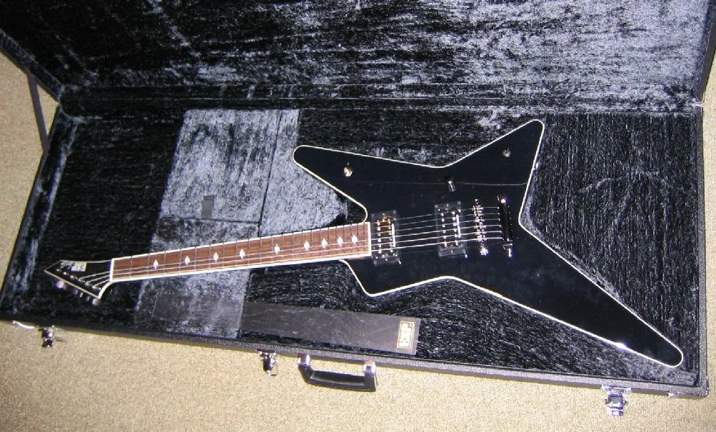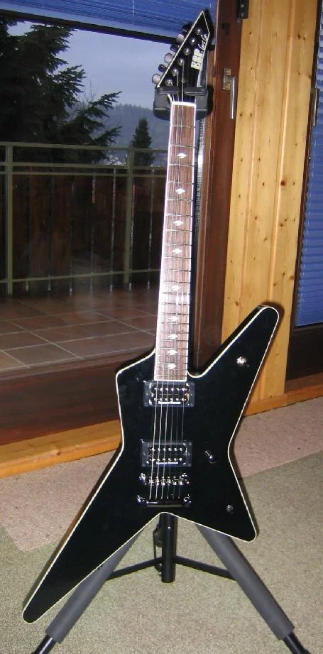 Frisch aus dem Koffer, noch glänzend schwarz ohne Fingerabdrücke, "so muß es sein" dachte ich neulich im Laden. Dann ein vorsichtiger Griff und raus damit. Die Gitarre ist mal wieder ein echtes Leichgewicht - und schwarz, YES. Das weiße Binding sieht auch richtig gut aus. Sehr schlicht das alles; gefällt mir. Die Form, typischer 80's Style halt, ist Geschmackssache, aber ich steh drauf 🙂