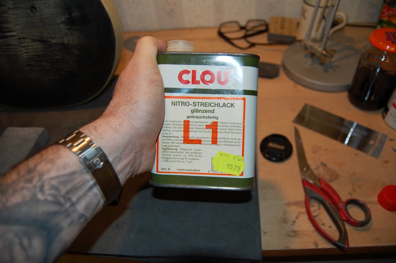 Egal, ich mache mal weiter. Heute hatte ich auch den ganzen Tag Zeit weiter zu machen. Frau fragt schon ob ich deppert bin. Ich habe mich für komplett schwarz entschieden. Decke in Burst, der Rest in Semideckend. Die Decke hat mich zwei Versuche gekostet. Jetzt sind 5 Schichten Nitro Schnellschleifgrund drauf und das ganze ist glatt wie, ihr wisst schon. 2 Schichten werden jetzt noch gespritzt und dann sollte der 1. Lackaufbau reichen. Die ersten Schichten habe ich mit einem Leinenballen aufgetragen. Tipp: Clou Schnellschleifgrund ist wesentlich besser zu verarbeiten wenn er 5:1 verdünnt wird. Der ist sowas von schnell trocken. Ich habe die ersten zwei Schichten komplett wieder runtergeschliffen. Mit dem Ergebnis das ich auch die Beize noch mal anschleifen musste. So muss das jetzt reichen.