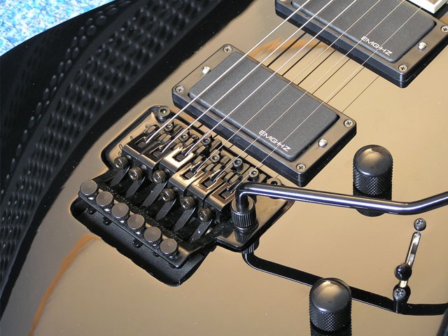 Der Headstock lässt die Gitarre sehr schnittig wirken. Die höheren Bunstäbchen wurden leider nicht richtig sauber geschliffen. Es ist ein etwas höherer Kraftaufwand nötig um saubere Legatolicks zu spielen. Dei 9er NPS Saiten (mit wirklich sehr vielen Wicklungen)sind in Ordnung und lassen die Finger sanft gleiten. Die Nut wurde sehr genau eingepasst, aber die Schrauben wirken minderwertig. Die EMG HZ Tonabnehmer wurden perfekt eingebaut. Das Floyd Rose wirkt überraschend stimmstabil und leicht bedienbar. Sämtliche Feinjustierungen am Tremolo funktieren wie sie sollten.
