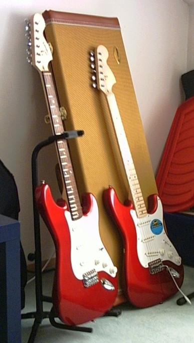 Aber optisch hat sie zwei Kriterien erfüllt, die ich prinzipiell als Kontrast zu meiner bisherigen Strat (eine „Blacky“ mit Maple Neck) wollte: den großen 70er Headstock und eine auffälligere Farbe, nämlich Candy Apple Red....... sehr schön!