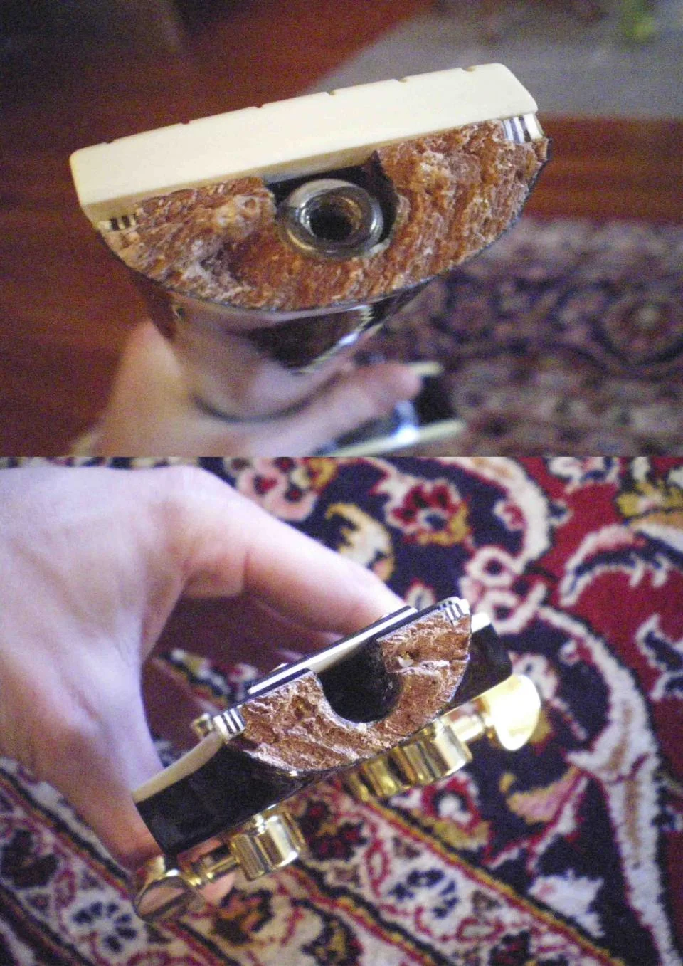 Un zwar genau am Übergang zum Griffbrett und auch noch relativ glatt...🙁