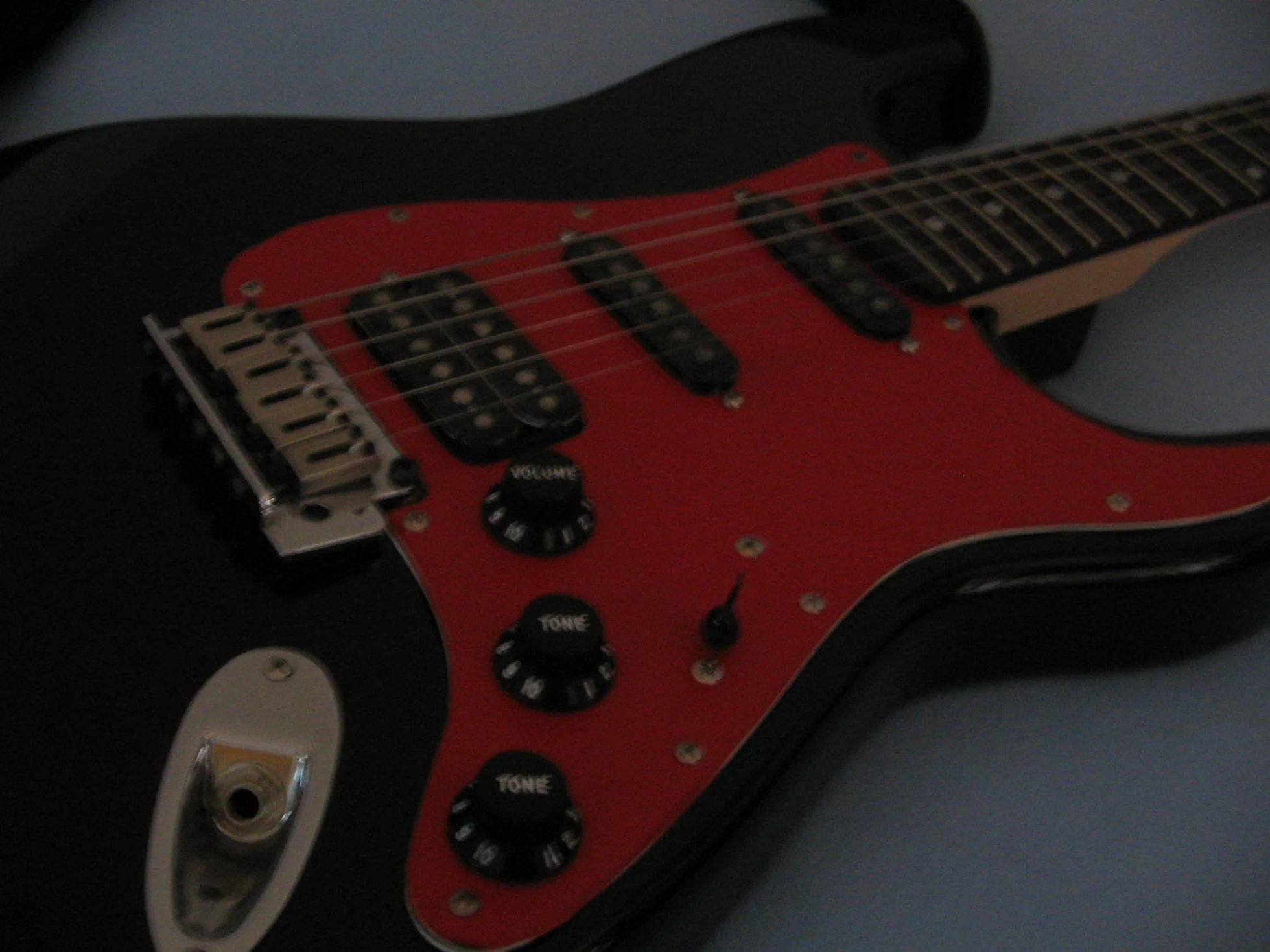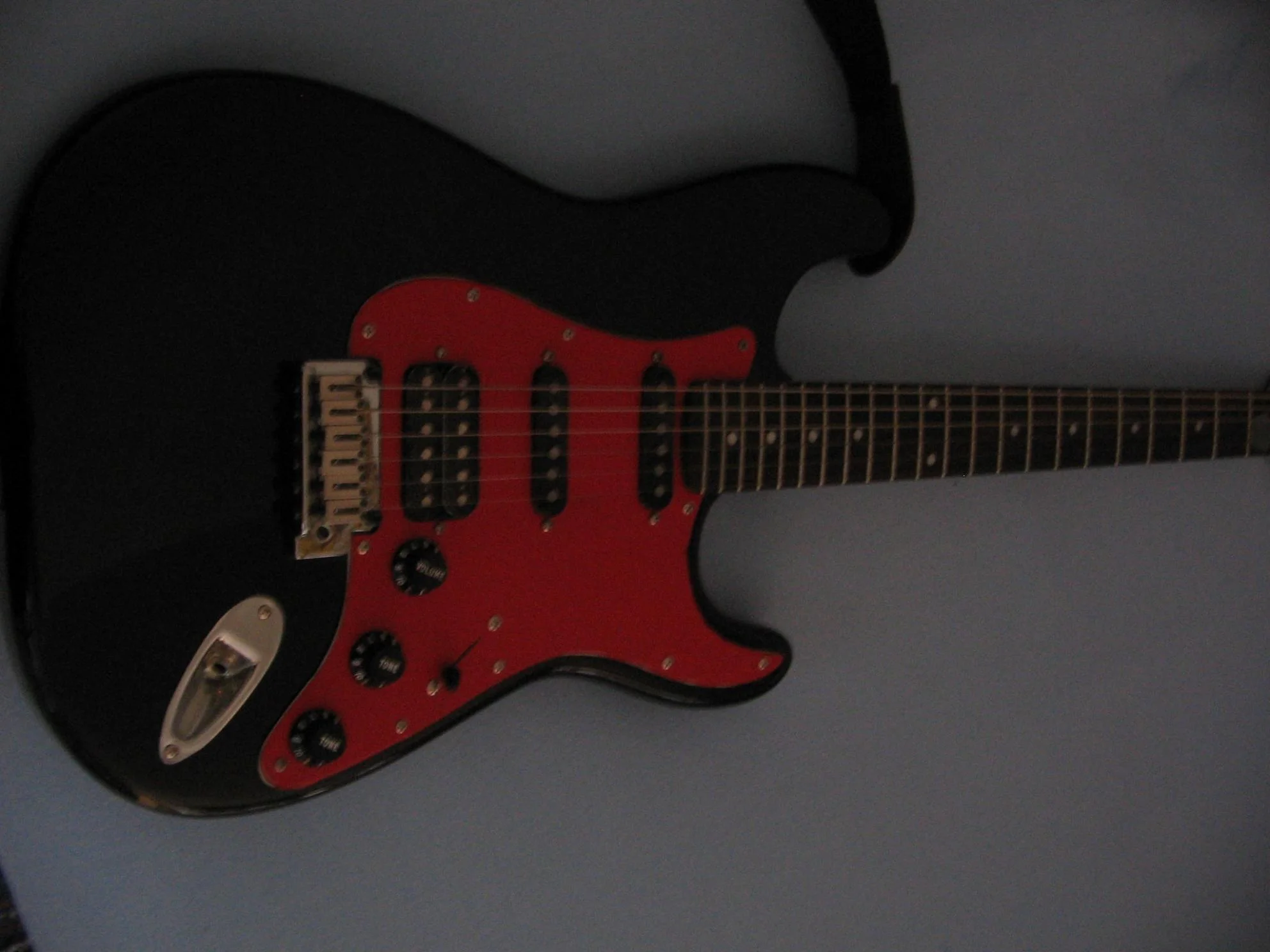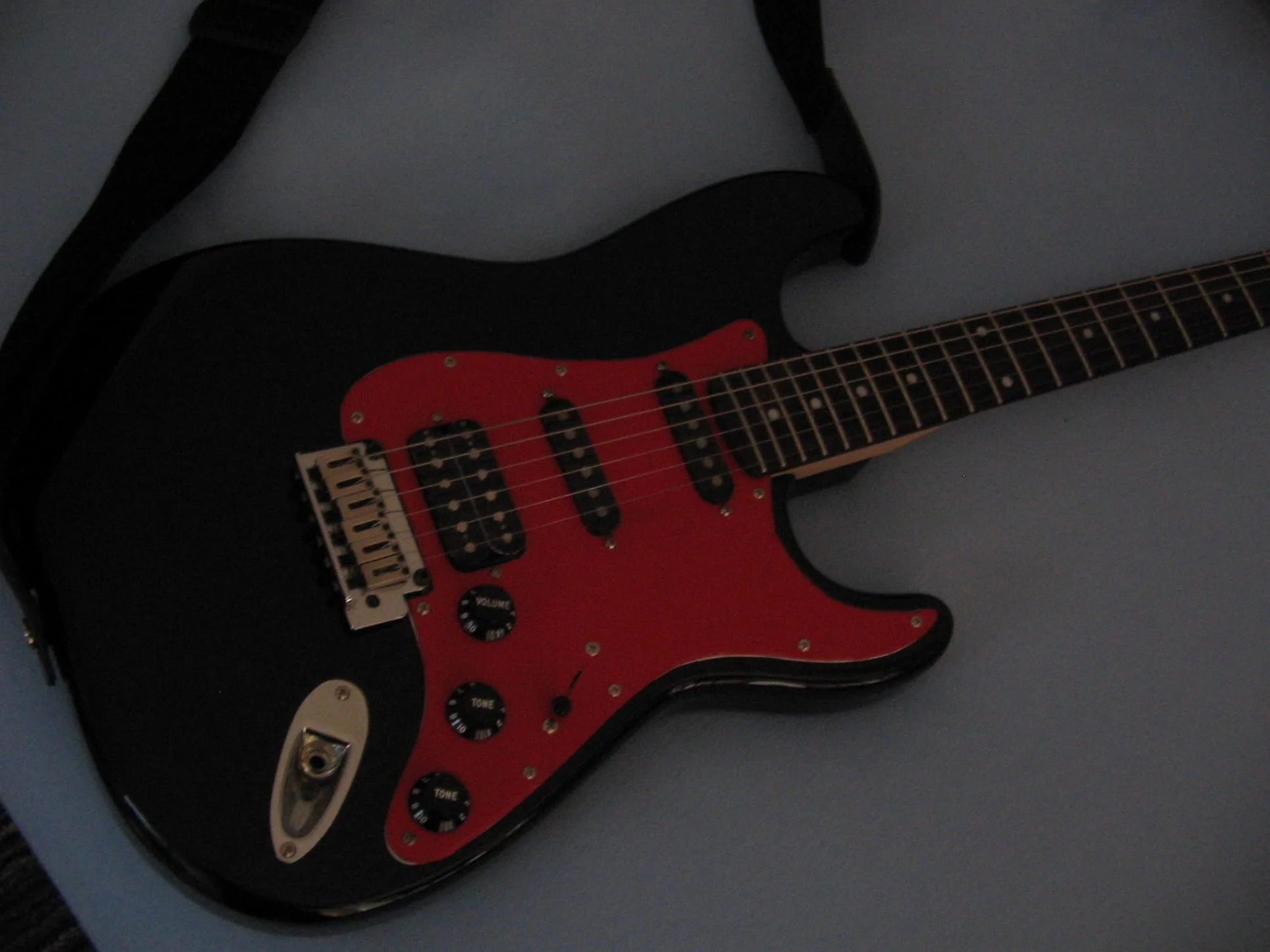 Es ist ja nun schon einige Monate her, als ich dieses schöne Teil bekam. Der erste Eindruck nach dem Auspacken war wirklich gut. Die Lackierung ist makellos ausgeführt, weder Kratzer noch Risse. Alle Schrauben gerade und fest angezogen. Auf dem Pickguard und den Pickups war eine Schicht Plastikfolie. Der Hals fühlt sich toll an und lässt sich wirklich traumhaft bespielen. Der 5-Wege Schalter arbeitet geräuscharm. Die Gitarre ist dazu auch noch sehr leicht, was sehr angenehm für den Rücken, beim spielen im stehen ist. Nach ausgiebigem testen der Gitarre und als ich mir sicher war, dass ich sie behalten werde, habe ich das weiße Pickguard mit roter Klebefolie geschmückt, da ich nirgends ein rotes Pickguard auftreiben konnte. Ich nutzte die Möglichkeit und tauschte den weißen 5-Wege Schalterknopf und die drei weißen Poti-Knöpfe durch Schwarze aus. Da die von mir bestellten Tonabnehmerkappen bei den Single-Coils nicht passten, lackierte ich die bereits vorhandenen ebenfalls Schwarz. Ich persönlich finde dass die Gitarre noch geiler mit einem Ahorn-Griffbrett aussehn würde.