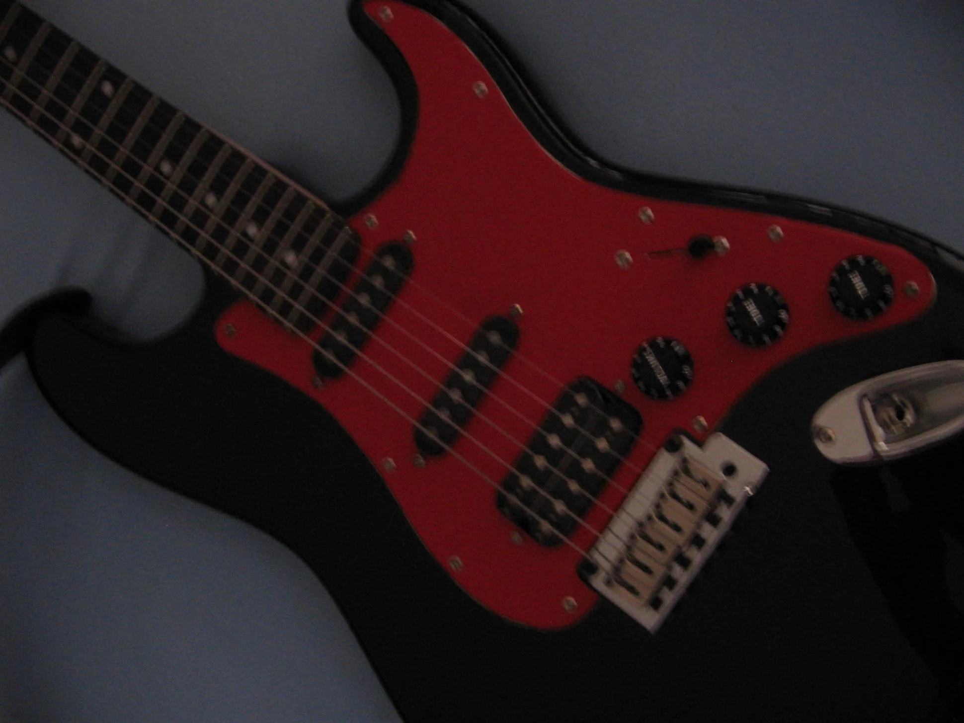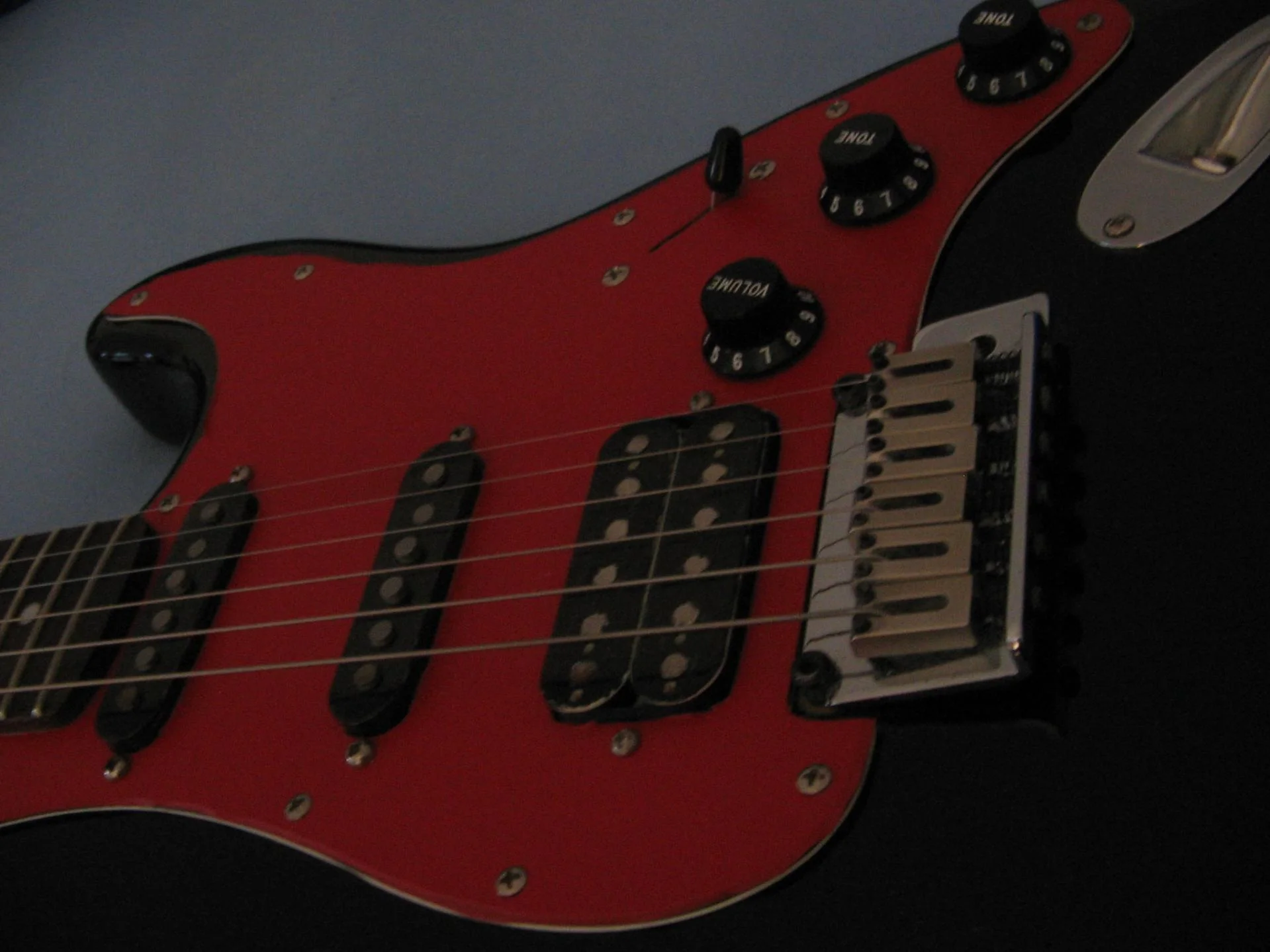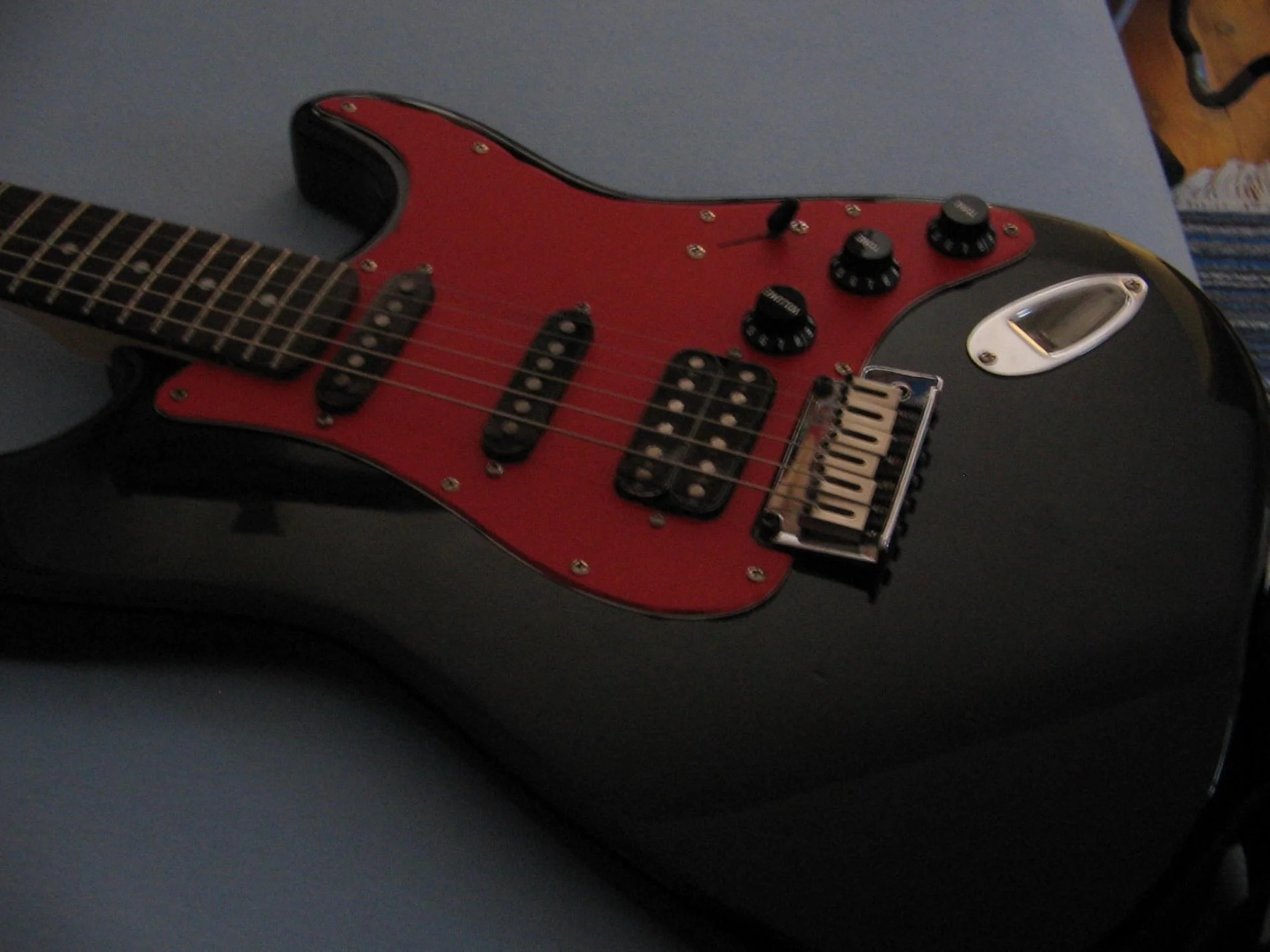 Es ist ja nun schon einige Monate her, als ich dieses schöne Teil bekam. Der erste Eindruck nach dem Auspacken war wirklich gut. Die Lackierung ist makellos ausgeführt, weder Kratzer noch Risse. Alle Schrauben gerade und fest angezogen. Auf dem Pickguard und den Pickups war eine Schicht Plastikfolie. Der Hals fühlt sich toll an und lässt sich wirklich traumhaft bespielen. Der 5-Wege Schalter arbeitet geräuscharm. Die Gitarre ist dazu auch noch sehr leicht, was sehr angenehm für den Rücken, beim spielen im stehen ist. Nach ausgiebigem testen der Gitarre und als ich mir sicher war, dass ich sie behalten werde, habe ich das weiße Pickguard mit roter Klebefolie geschmückt, da ich nirgends ein rotes Pickguard auftreiben konnte. Ich nutzte die Möglichkeit und tauschte den weißen 5-Wege Schalterknopf und die drei weißen Poti-Knöpfe durch Schwarze aus. Da die von mir bestellten Tonabnehmerkappen bei den Single-Coils nicht passten, lackierte ich die bereits vorhandenen ebenfalls Schwarz. Ich persönlich finde dass die Gitarre noch geiler mit einem Ahorn-Griffbrett aussehn würde.